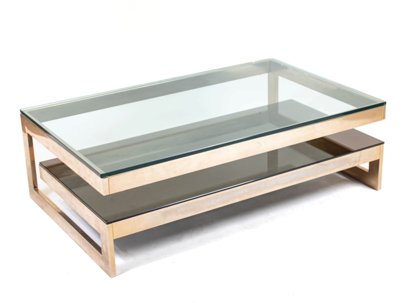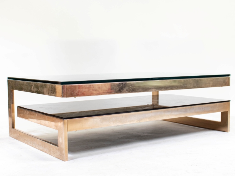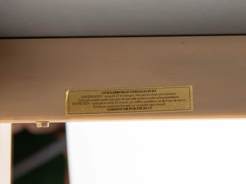 Gold-plated metal table, original label, glass and mirror top