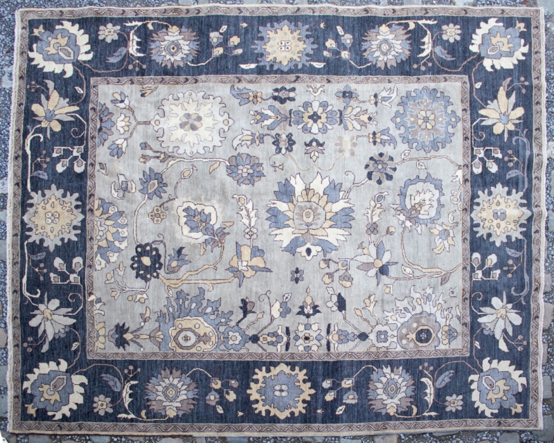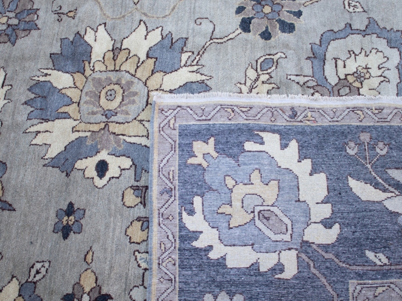 turquoise grey mottled background, decorated with flowering stems, blue border with floral scrolls.