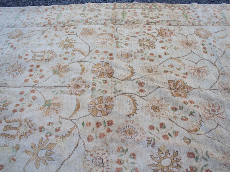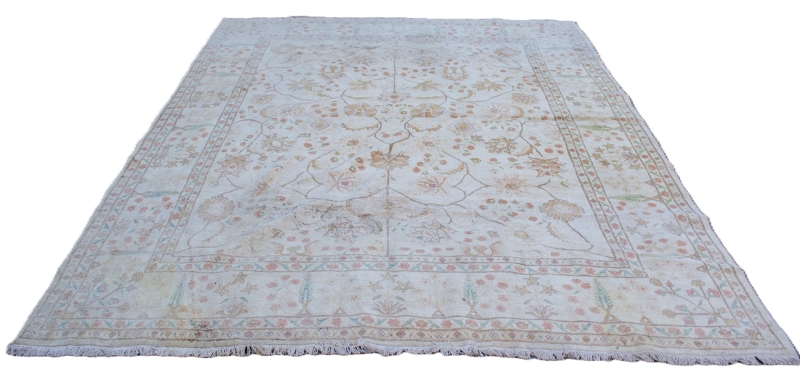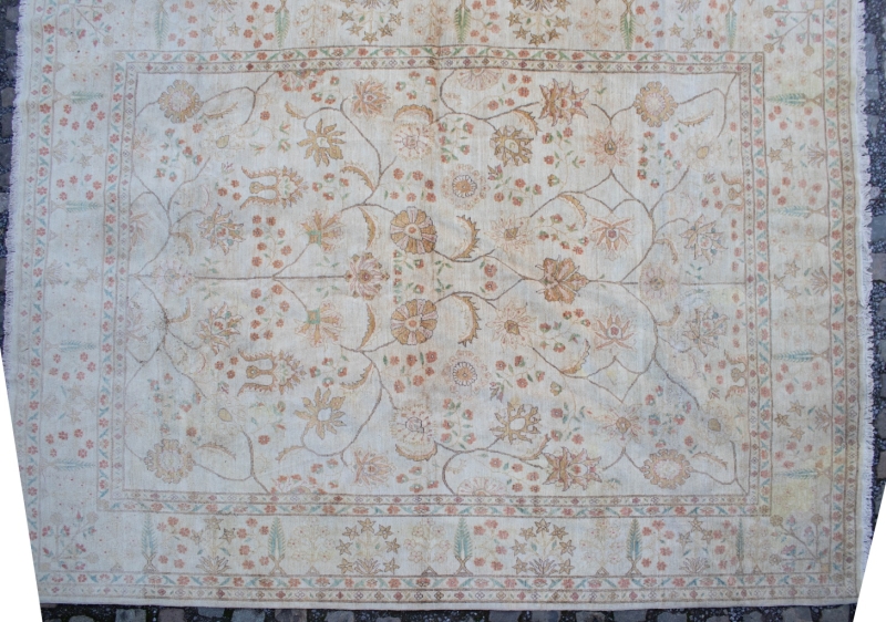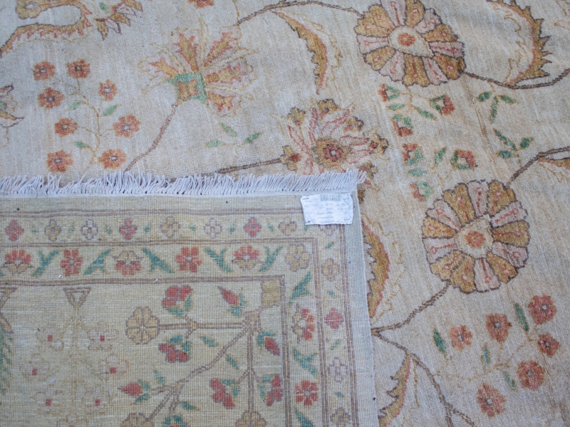 cream background, decorated with flowering stems, border of flowering trees and cypresses