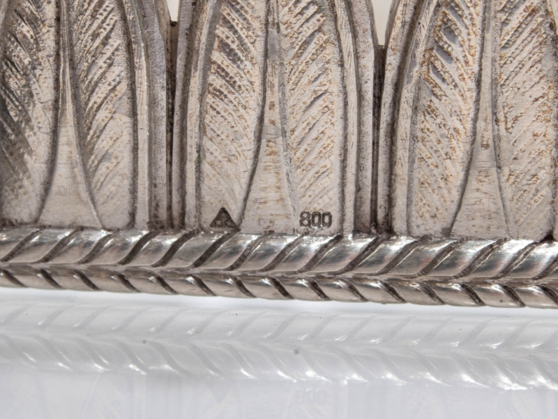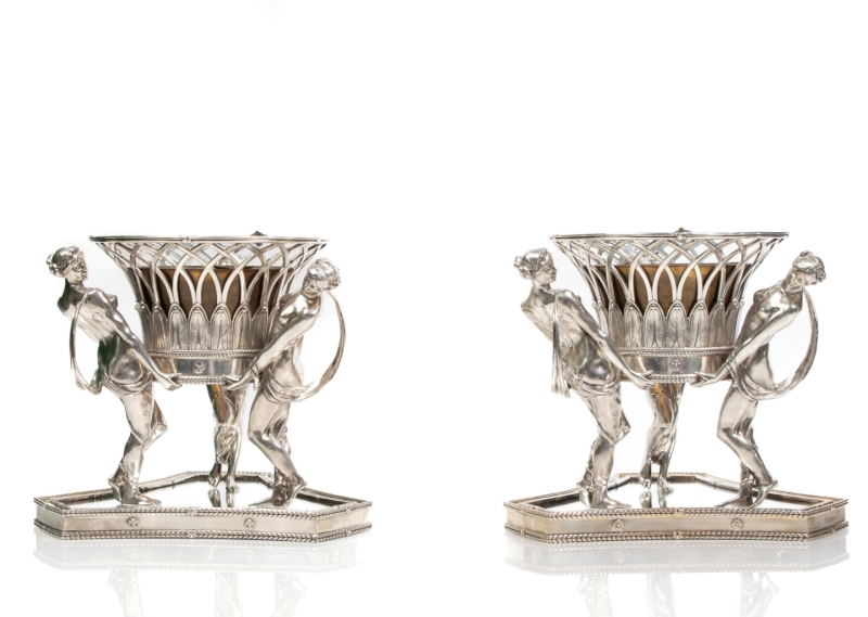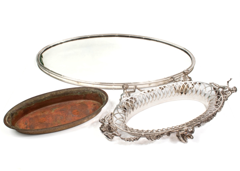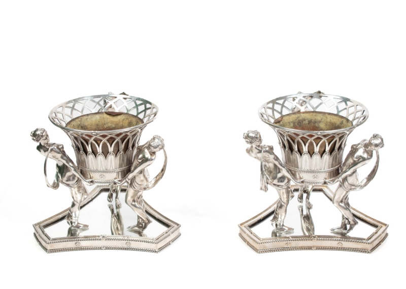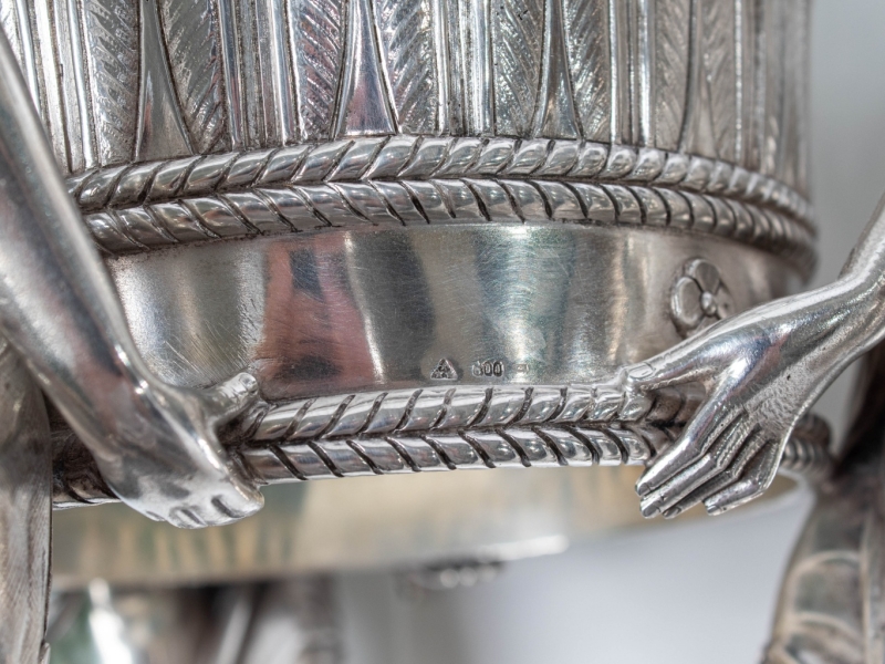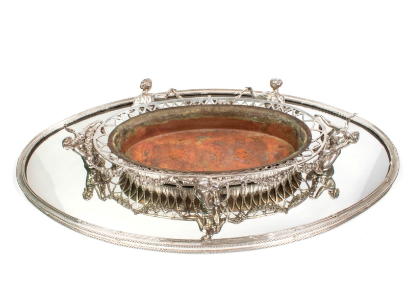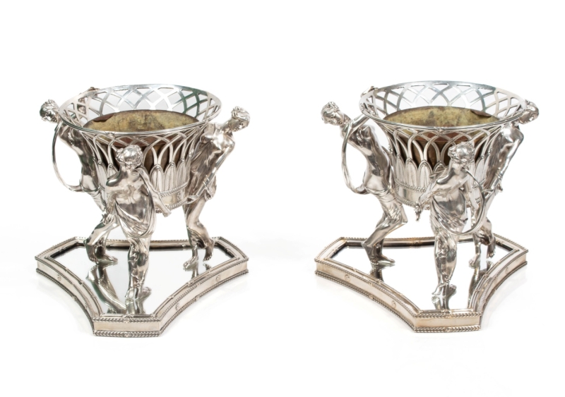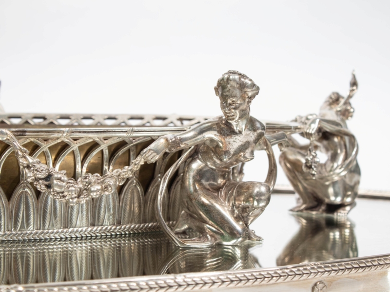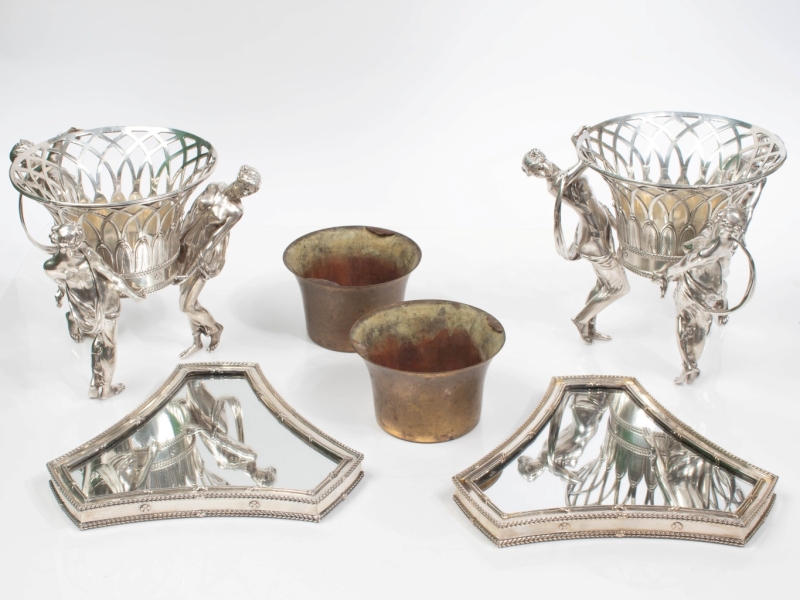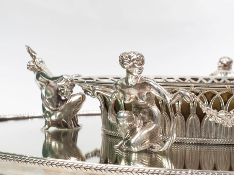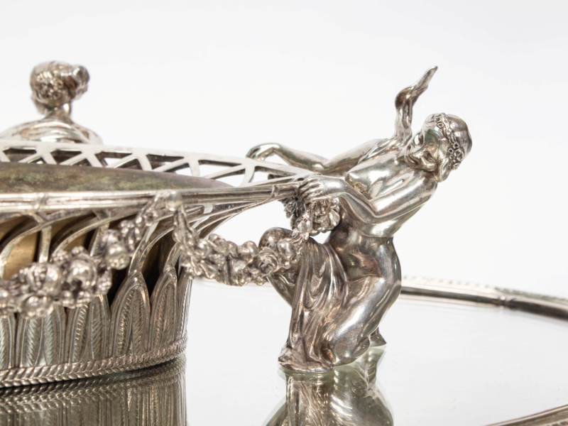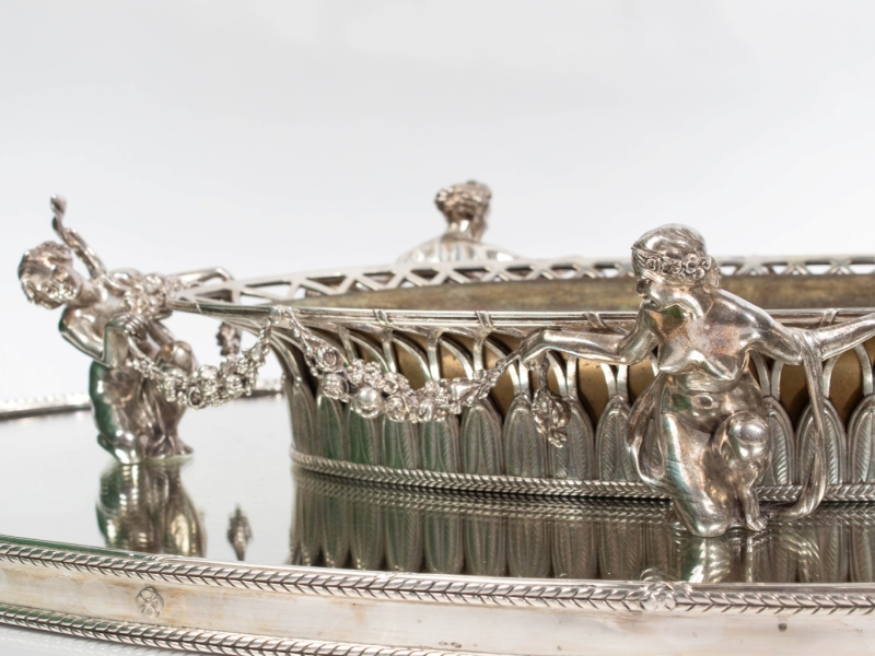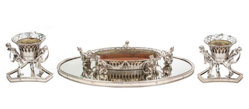in silver and mirror, comprising a mirrored tray, a planter with its original removable copper receptacle, two tripod bowls, their original removable copper receptacles and mirrors. Hallmarked M.O and 800 on each piece.