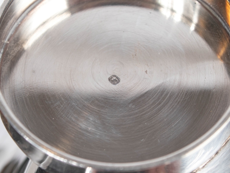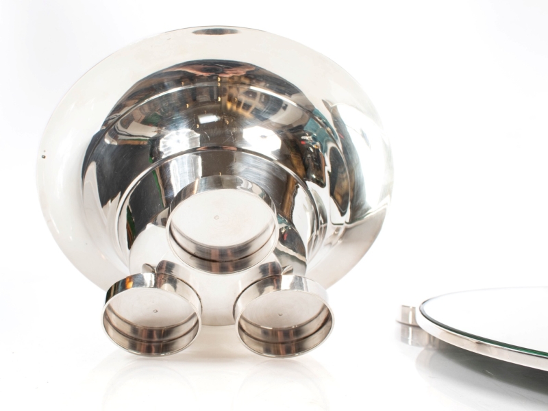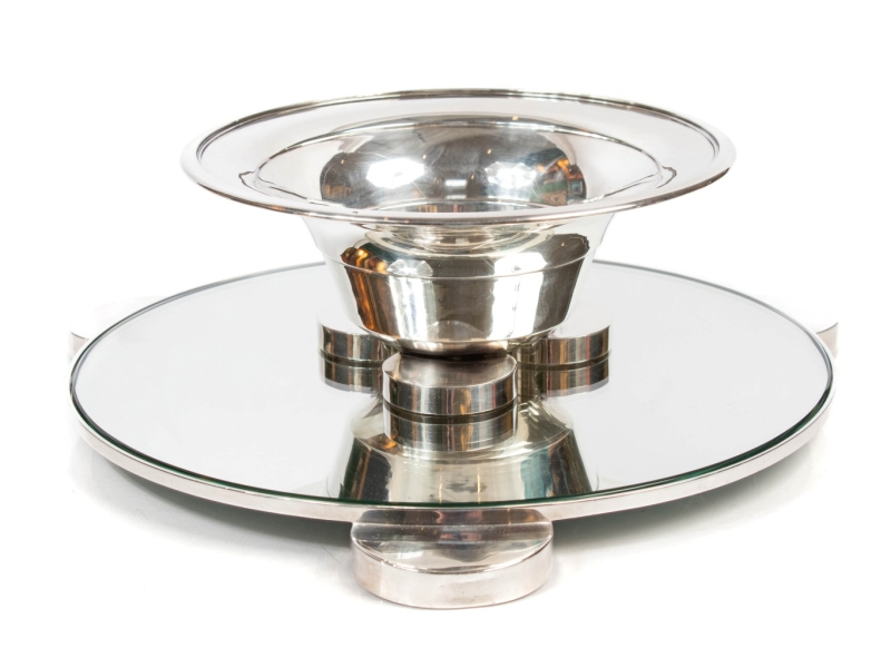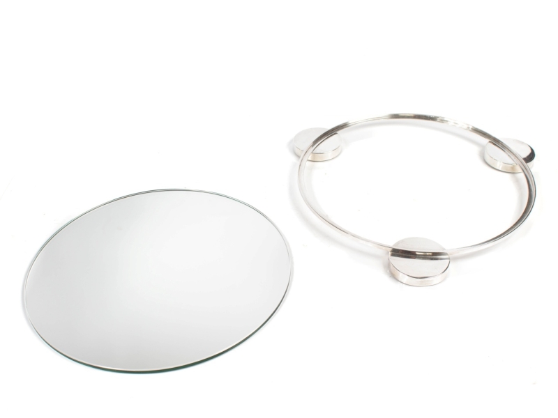 in silver and mirror, comprising a tripod bowl (621.6 g) and a tripod mirror tray with removable mirror (562.2 g). Minerva head hallmark and M.O.
