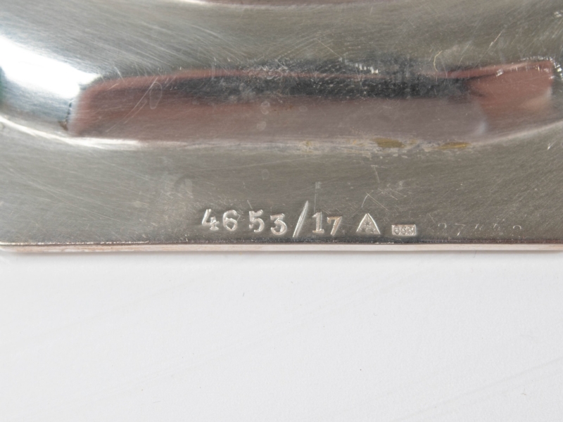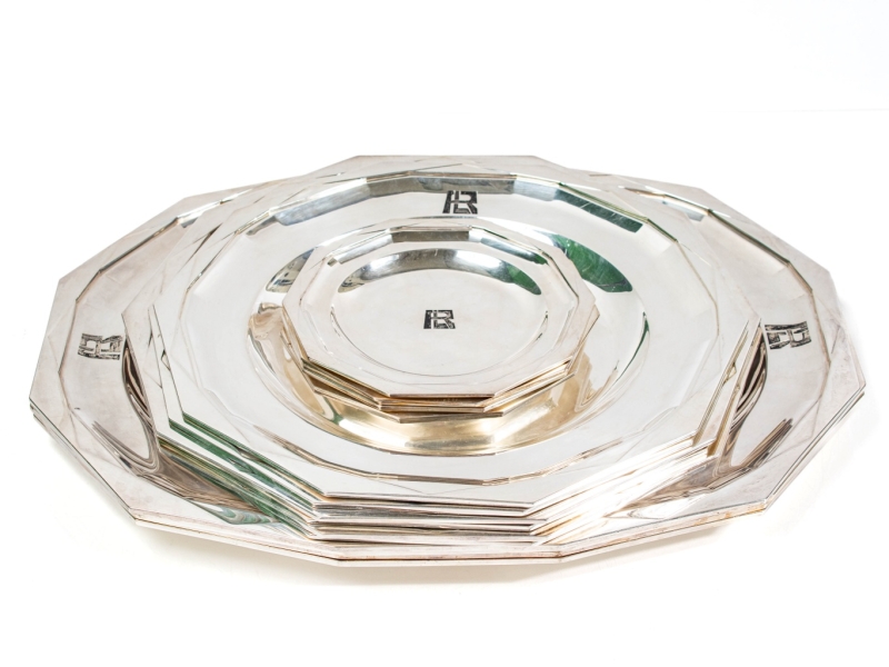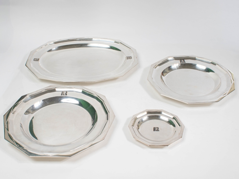 comprising four large oval dishes (45 x 35 cm), four large round dishes (D / 33 cm), two medium round dishes (D: 31 cm), six bottle coasters (D: 16.3 cm), seven silver and crystal bowls (D: 14 cm). Hallmarks M.O, 835 and numbers.