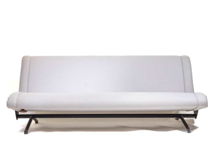 with reclining backrest and seat to form a bed, metal frame, foam padding, covered in light grey wool. Manufacturer's mark