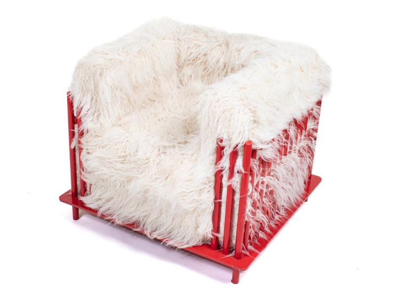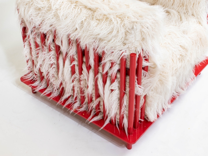 Red lacquered steel and cushions filled with faux sheepskin