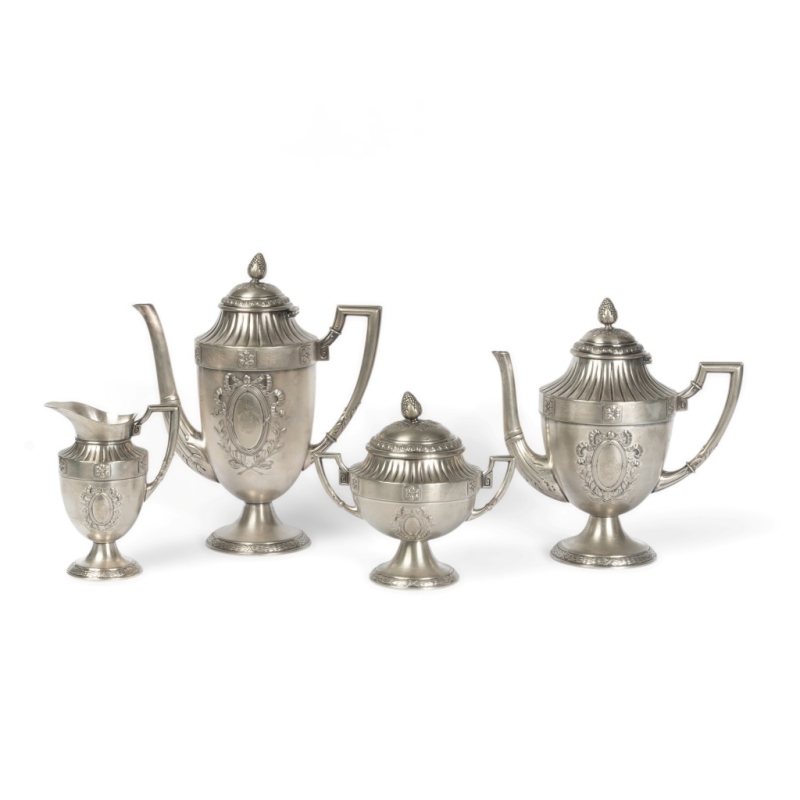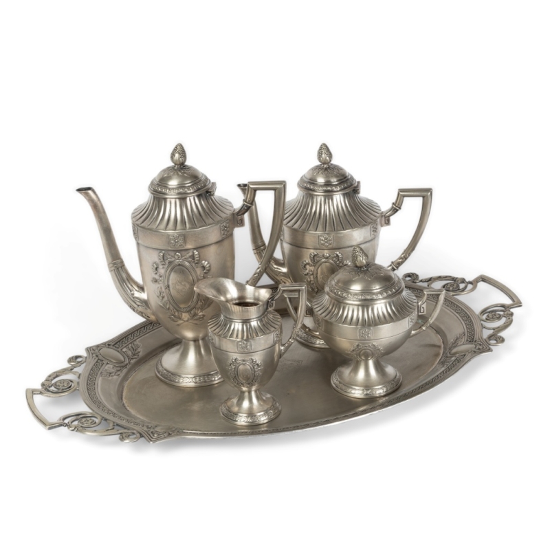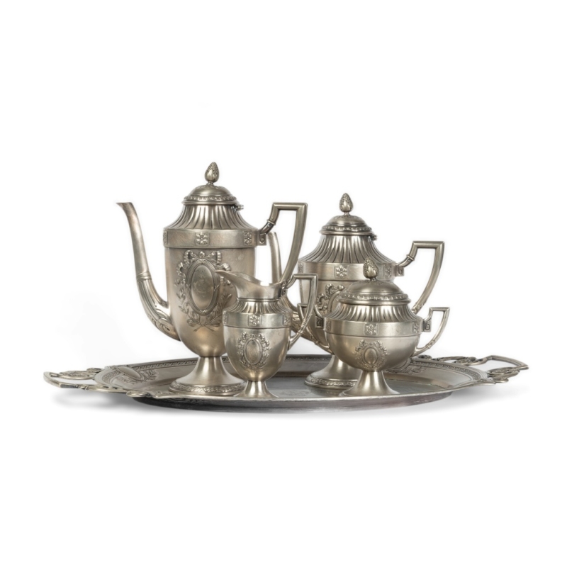 in silver-plated metal comprising a coffee pot, a teapot, a sugar bowl, a milk jug and a tray