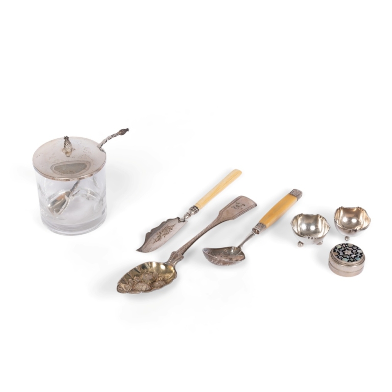 including a mustard pot (JE Caldwell), a pill box (Egypt), a knife (Netherlands), two salt cellars (Belgium including Wolfers), a spoon (unidentified), a spoon (France)