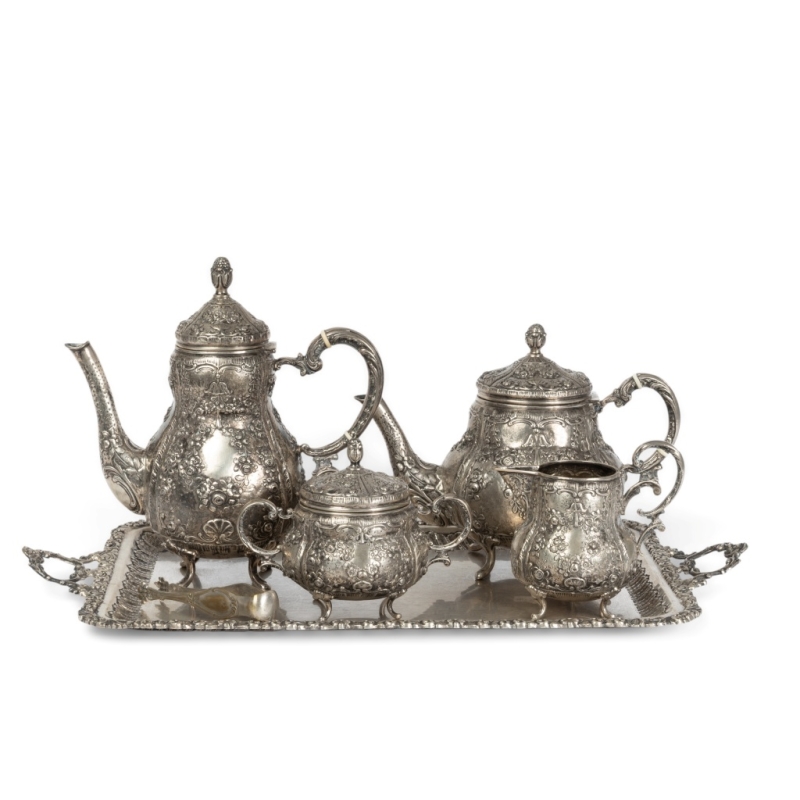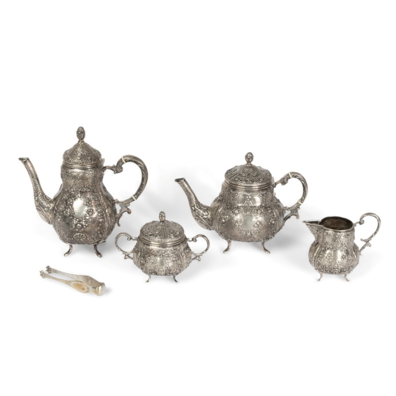 in silver, comprising a teapot, a coffee pot, a milk jug, a sugar bowl and a tray. Hallmarks on each piece