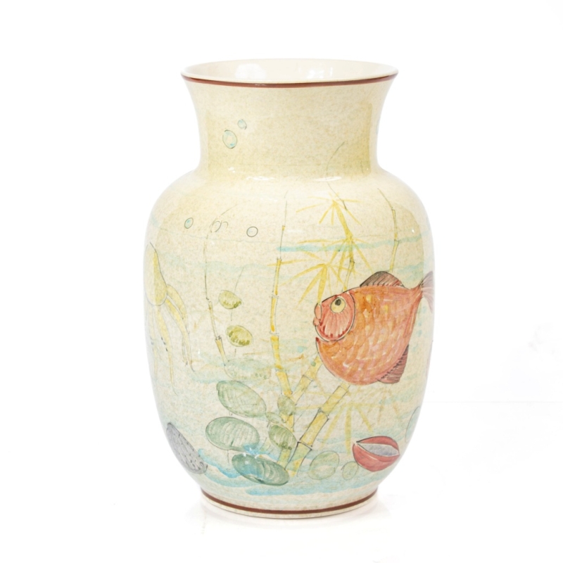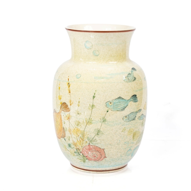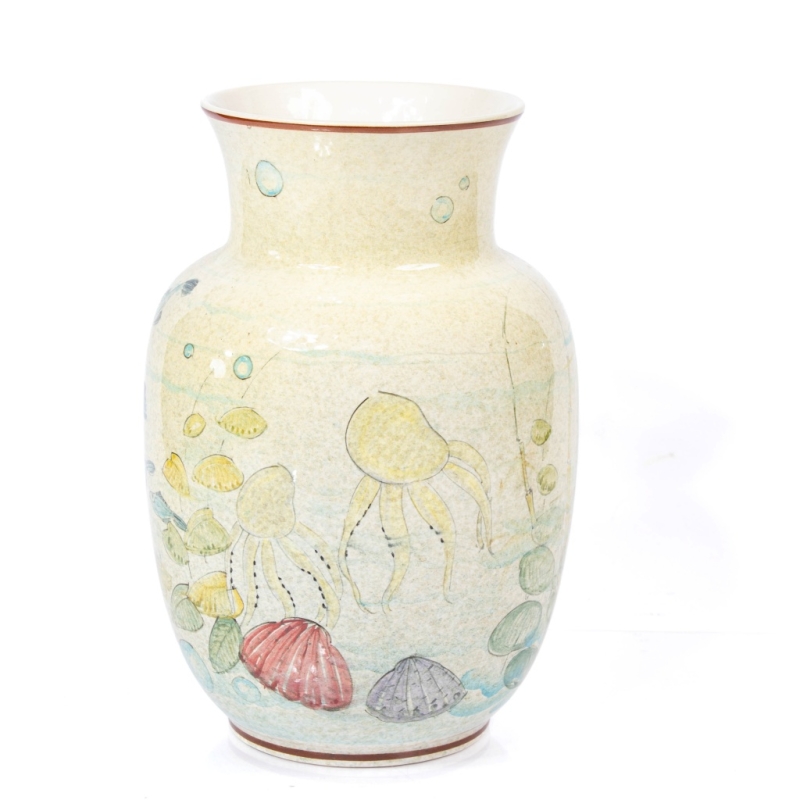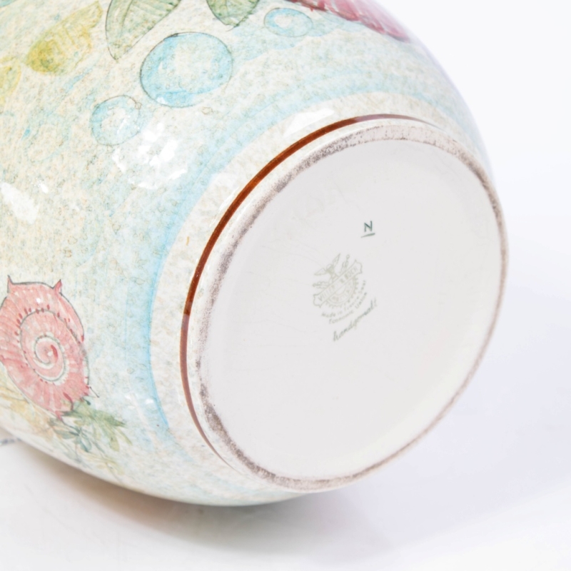 in polychrome glazed ceramic decorated with fish, octopuses, ammonites, etc., signed under the base