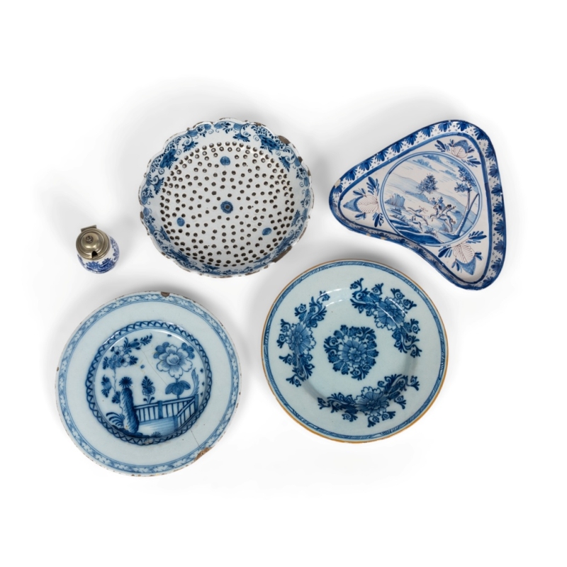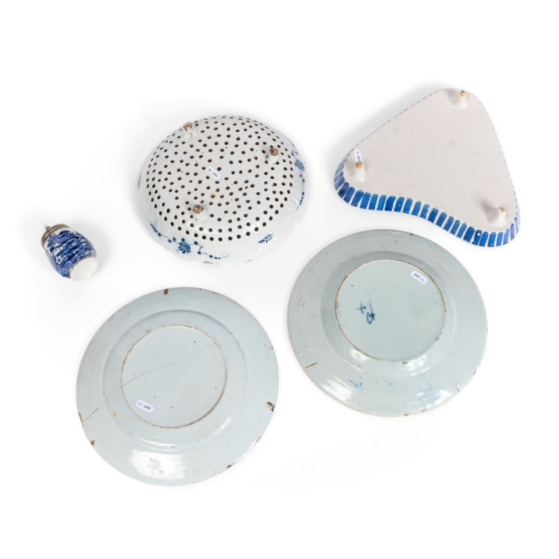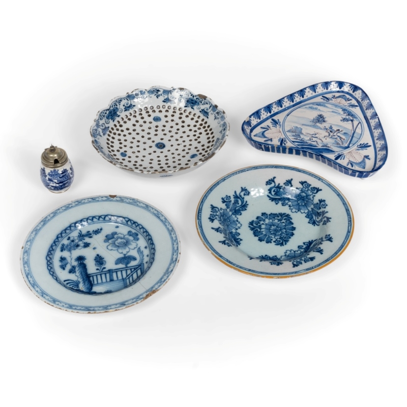 in white and blue earthenware comprising a strawberry dish, two plates (one cracked) and a heart-shaped dish. A mustard pot is included.