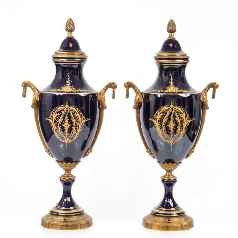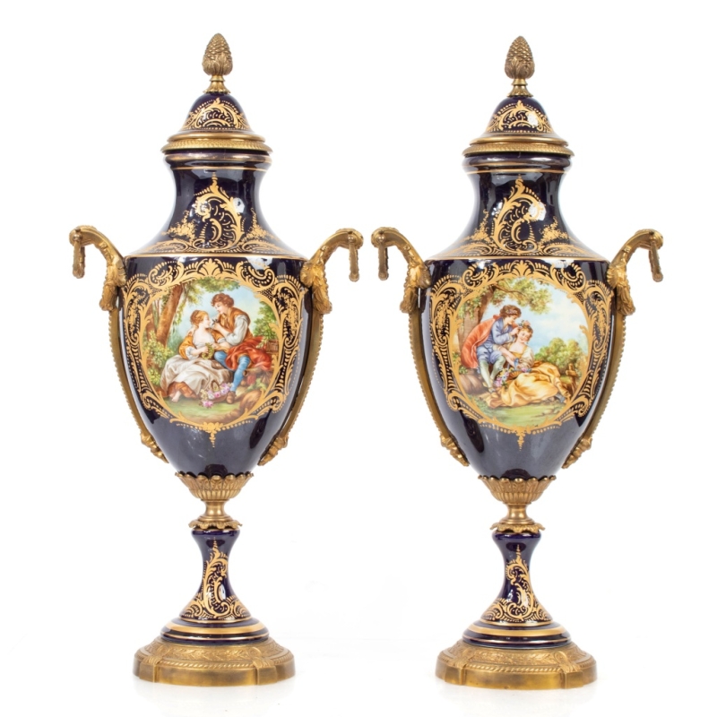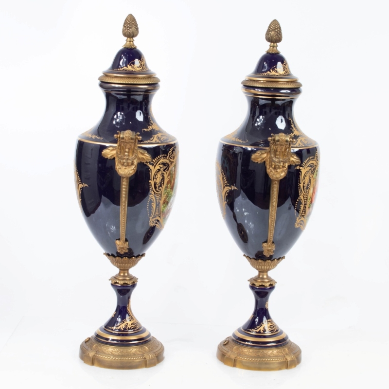 in enamelled porcelain decorated with cartouches on a blue and gold background, gilt bronze mounts