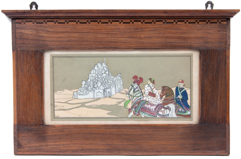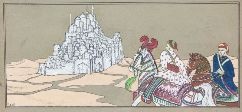 Couple of horsemen in front of a fortified town