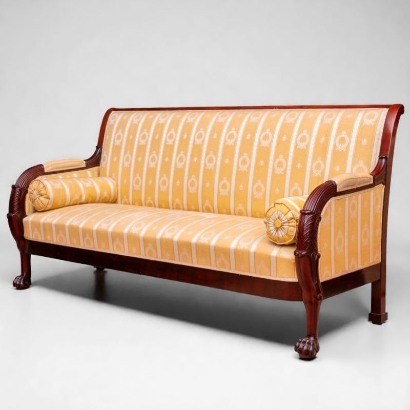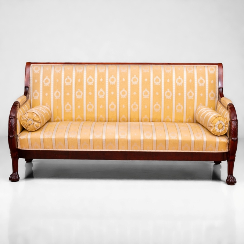 in mahogany, upholstered in yellow and white fabric. Two cushions are included.