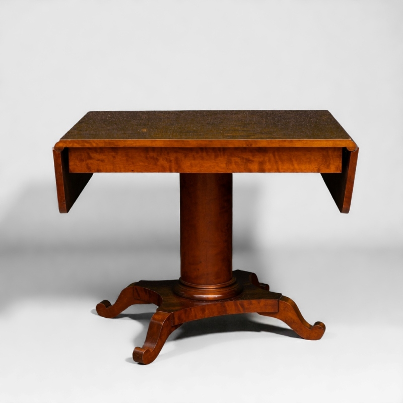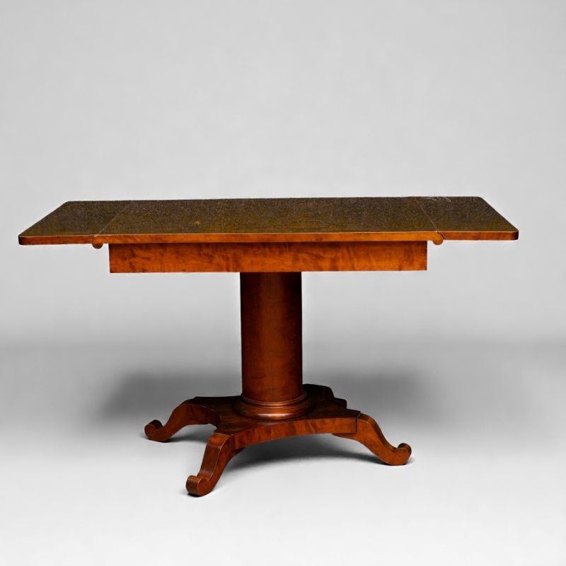 Console table in burr veneer with column-shaped base on four legs.
