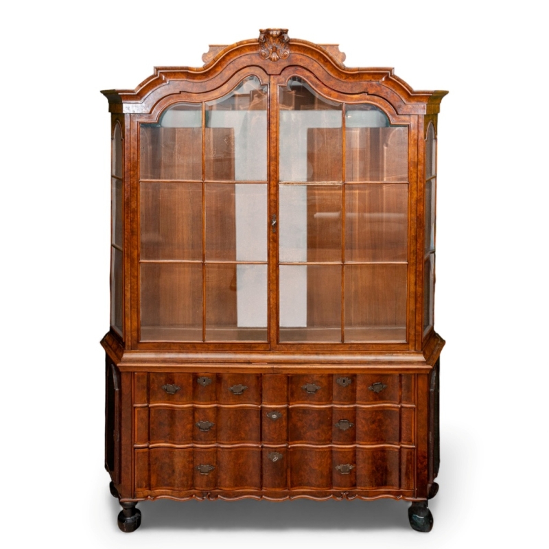 in burr veneer with three drawers and two doors in the lower section and display cabinet in the upper section