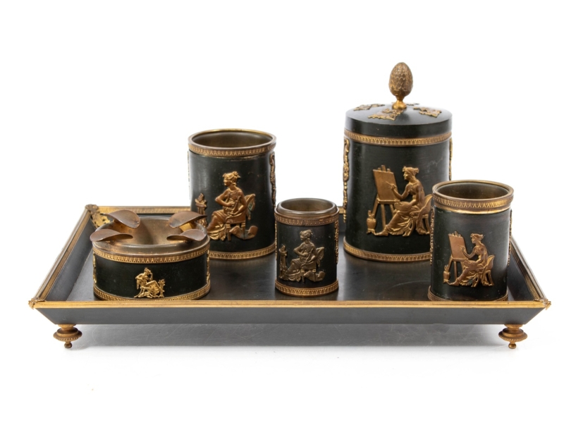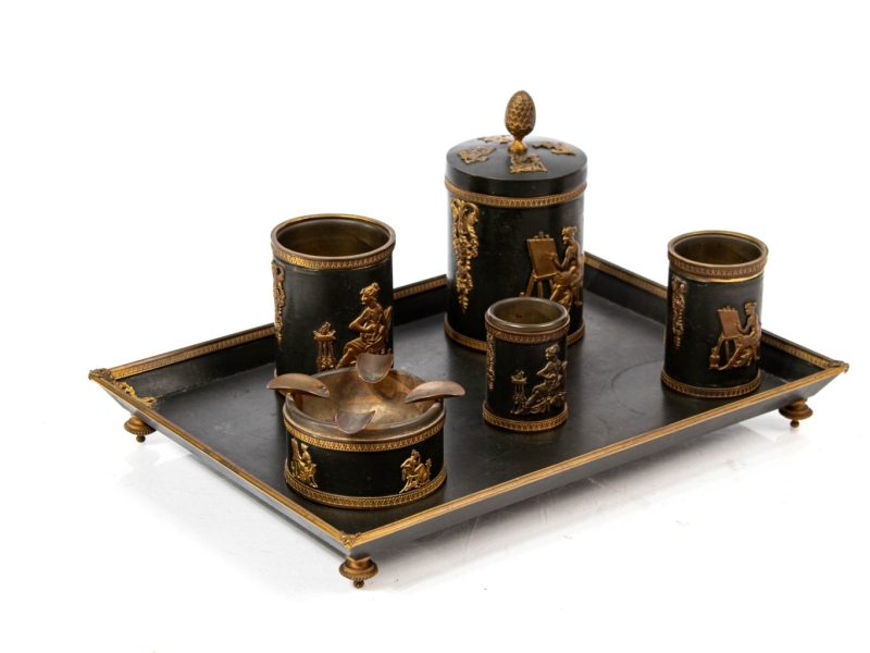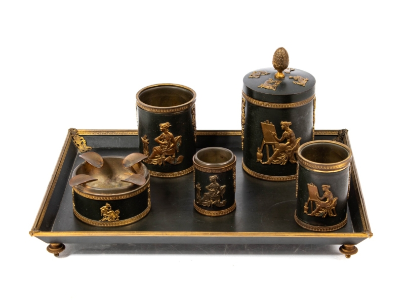 in dark grey and gold patinated brass comprising a box, three cylindrical pots, an ashtray and a tray.