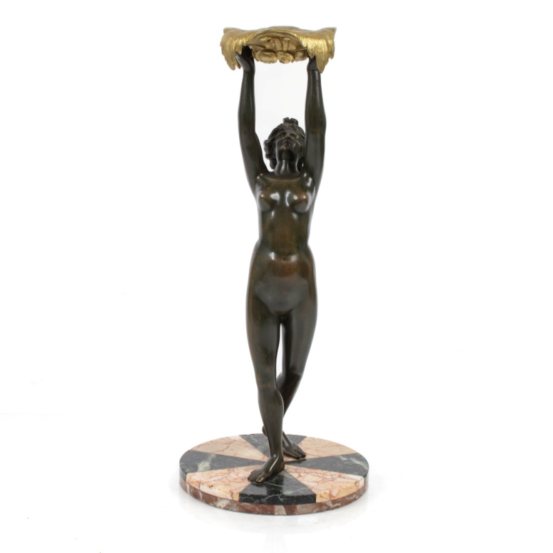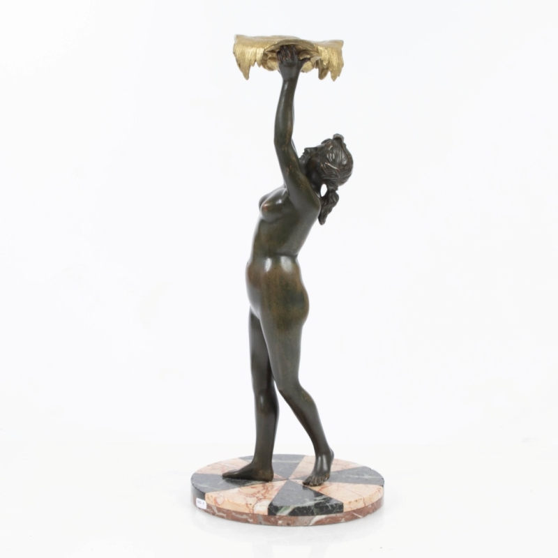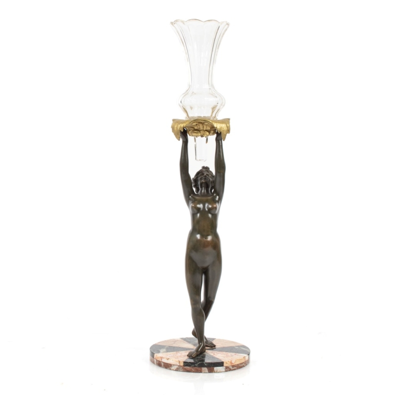 in bronze with brown and gold patina, marble base and crystal tulip (probably added later)