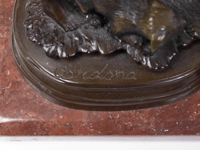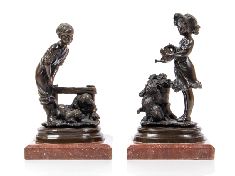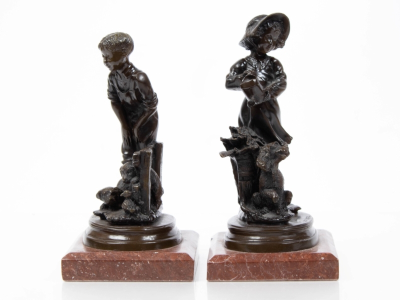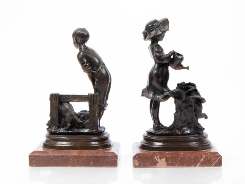 pair of bronze sculptures with brown patina, signed on the terrace, red marble bases