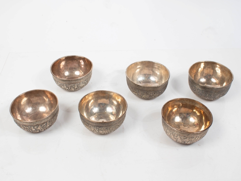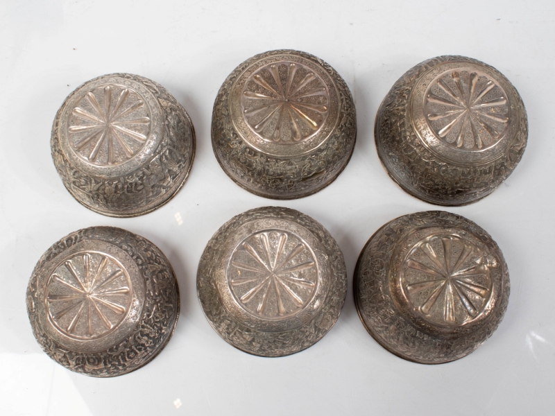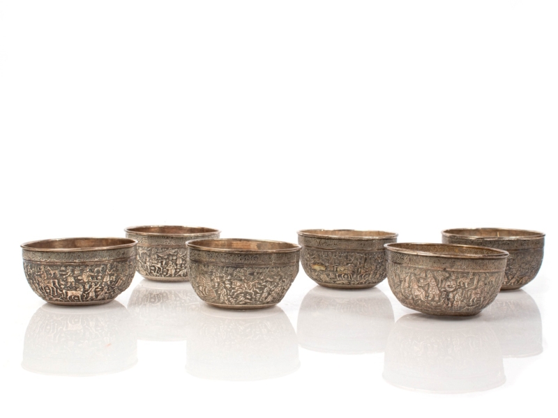 in repoussé silver, decorated with historical motifs. The rims are adorned with epigraphs.