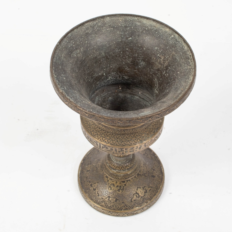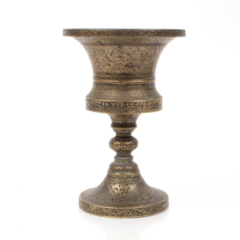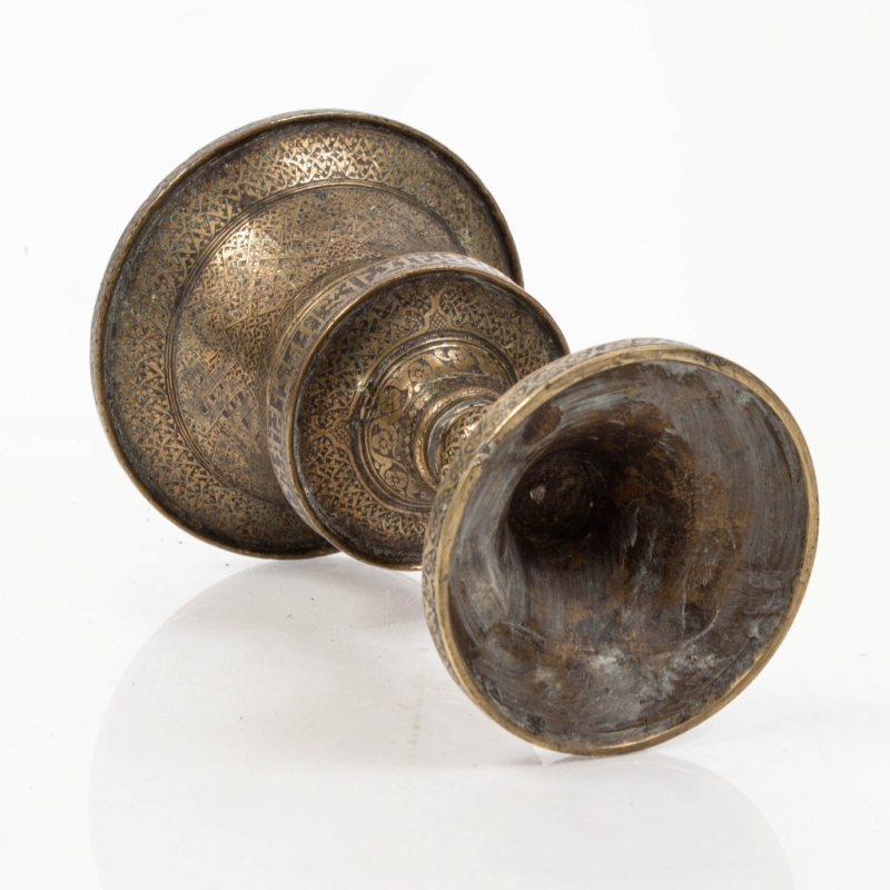 made of brass from the Qajar period, on a pedestal, featuring geometric decorations, a pseudo-Kufic frieze, and small silver inlays.