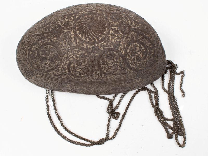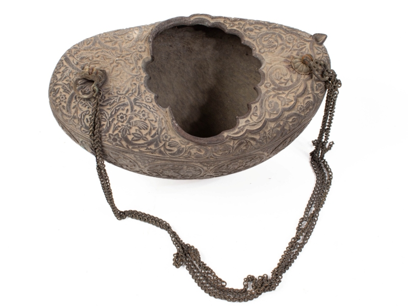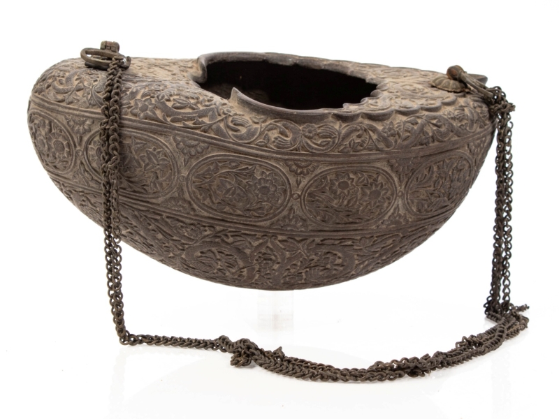 Kashkul, or dervish's alms bowl, made of engraved coco de mer. The engraved decoration features stylised floral scrolls and dragons. It is adorned with a brass chain.