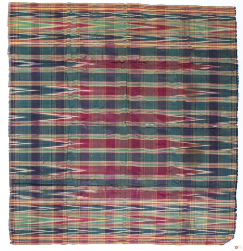 Daraee Bafi ikat made of silk decorated with geometric shapes in red, blue and green. It has several holes.