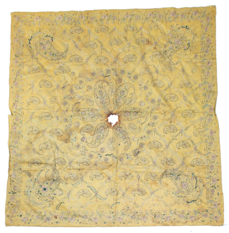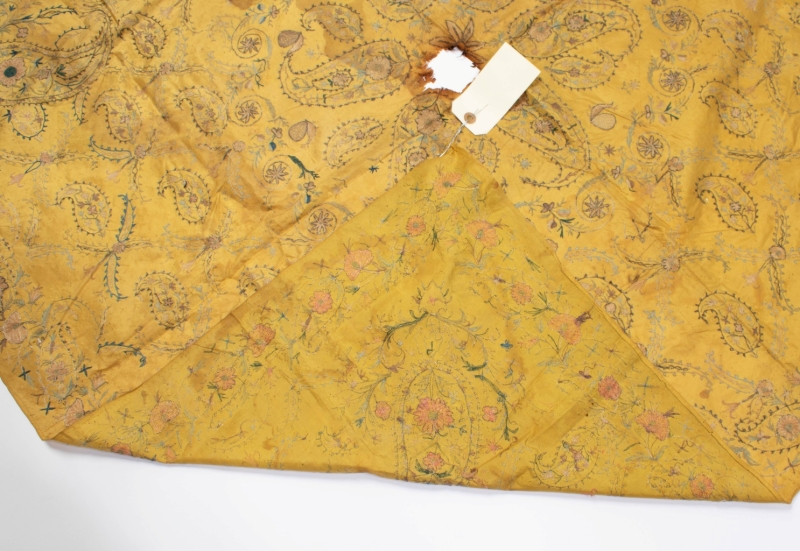 Yellow silk background decorated with boteh motifs in silk thread and a floral border.