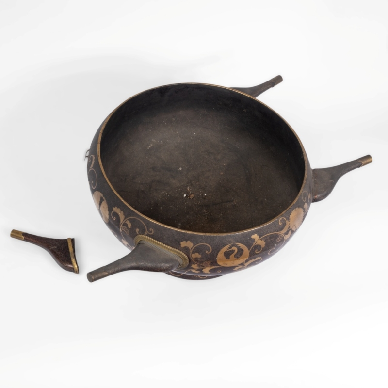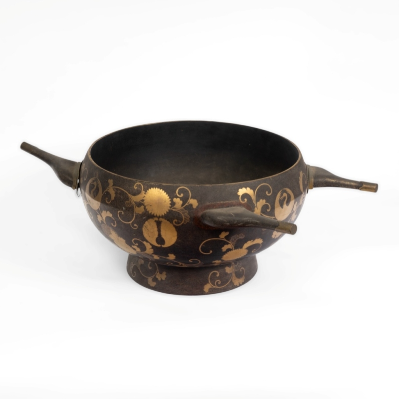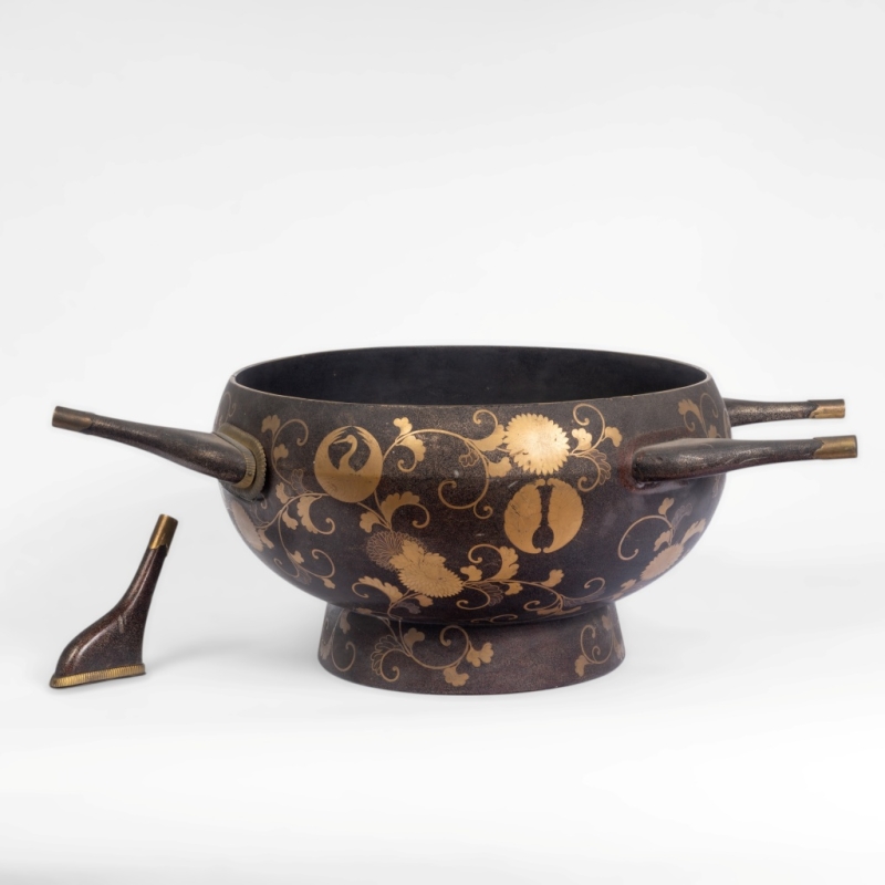 decorated with hira maki-e gold lacquer mon and chrysanthemums in chrysanthemums. (One handle detached, damage).