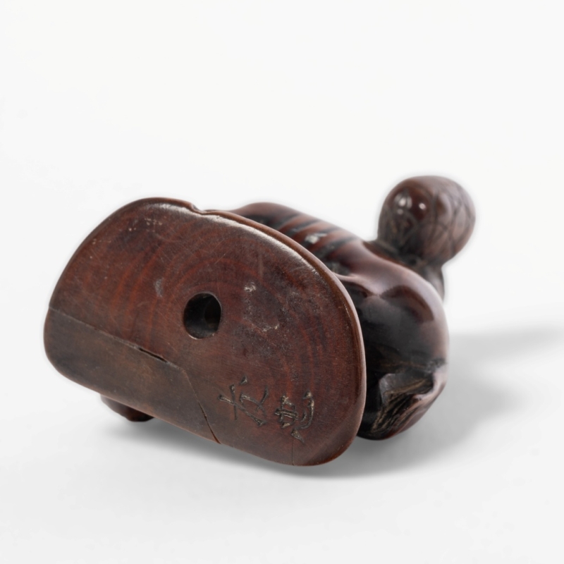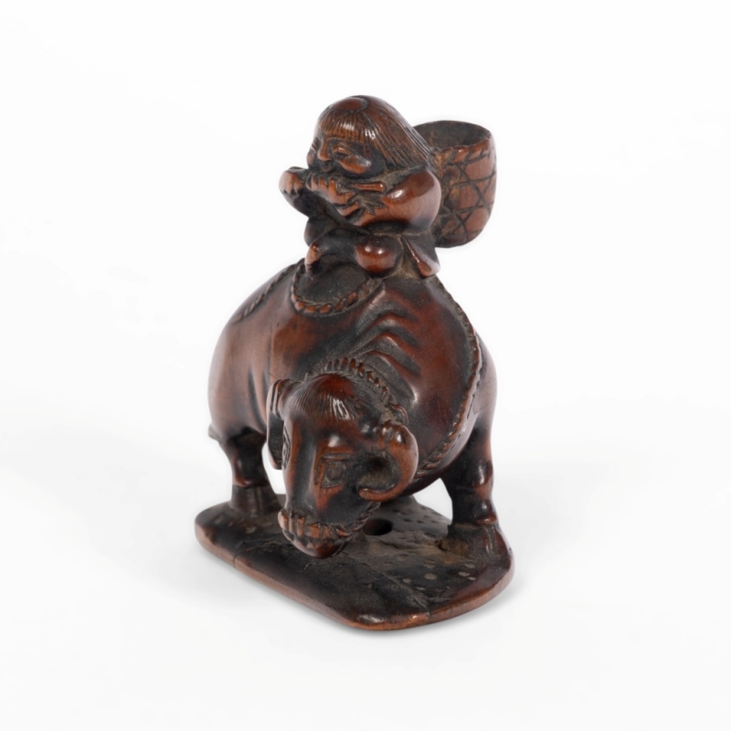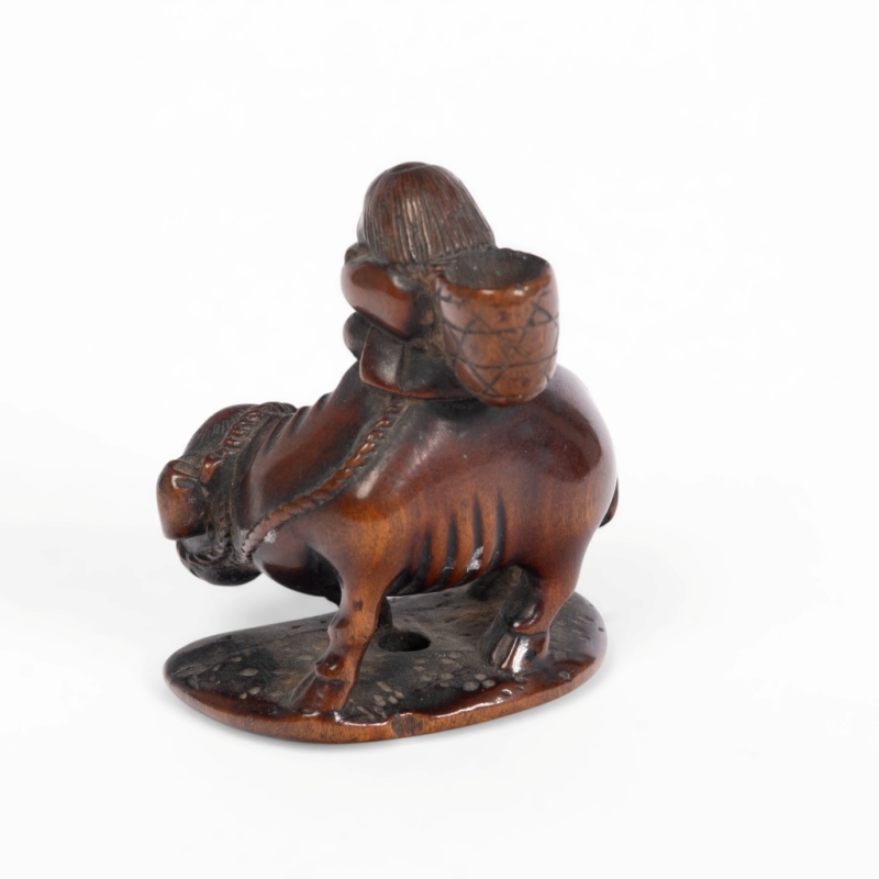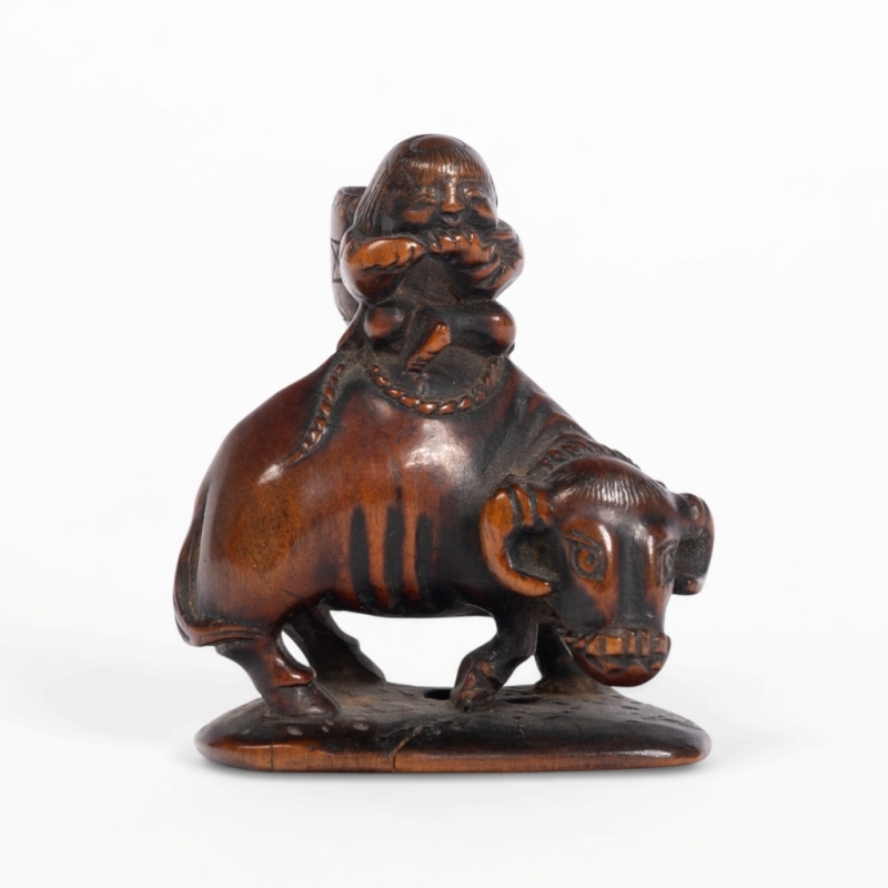Boxwood netsuke, Kintaro sitting on the back of a buffalo playing the flute