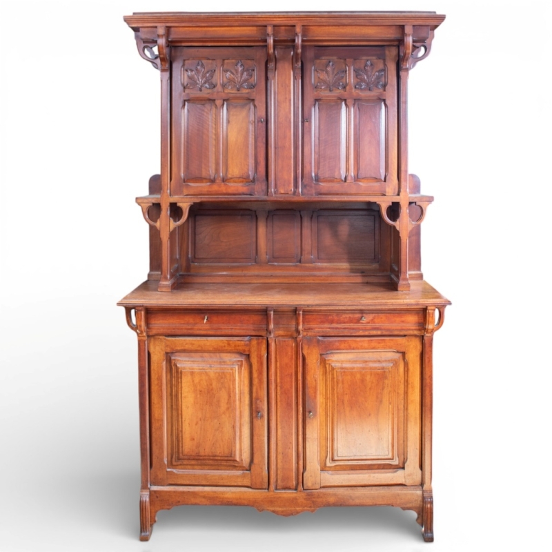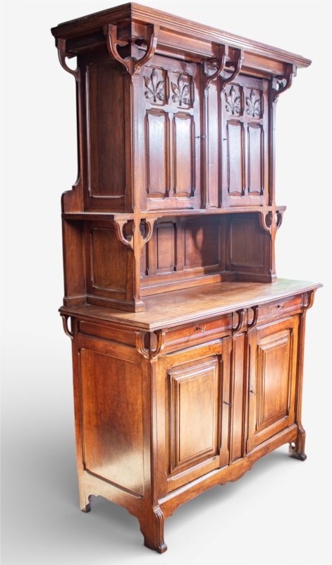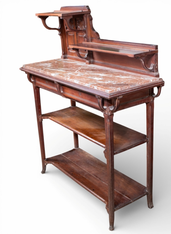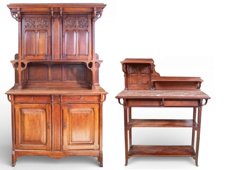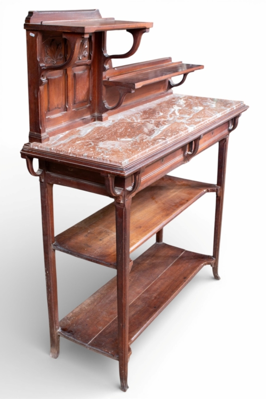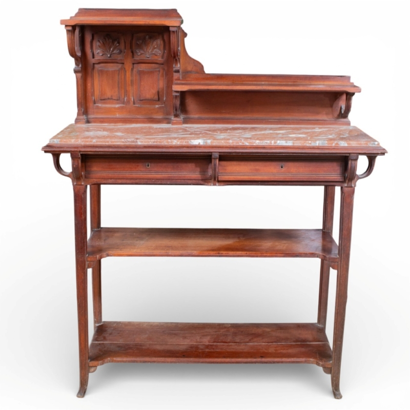 in carved mahogany and marble comprising a large sideboard and a serving trolley