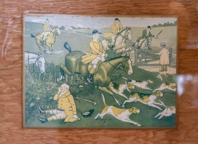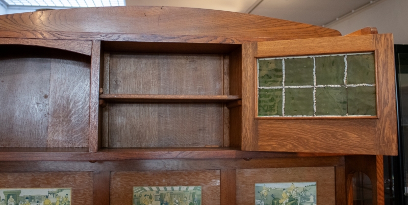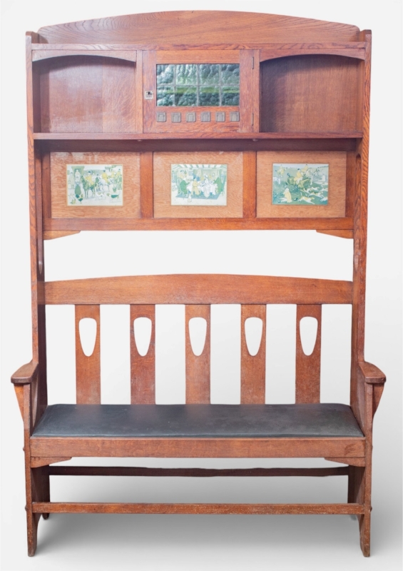 in oak, green hammered glass, inlaid with three colour engravings in the style of Harry ELIOTT (1882–1959) or Cecil ALDIN (1870–1935)