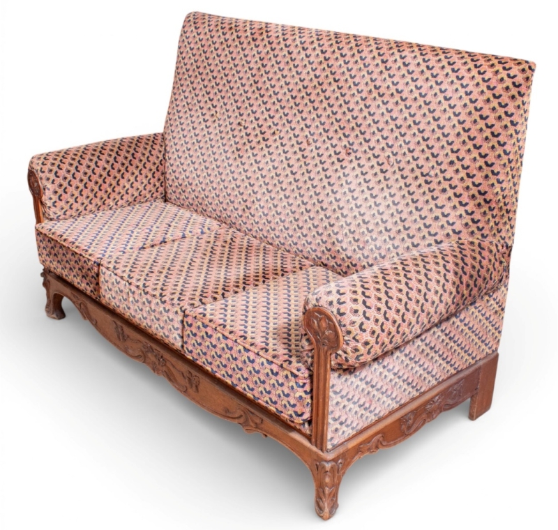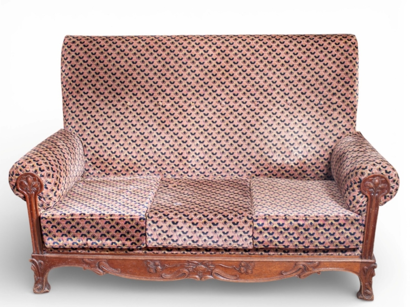 in stained wood, finely carved with a stylised floral design, upholstered in pink, black and yellow velvet.