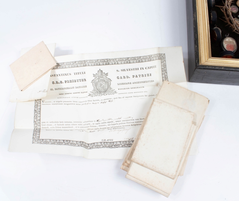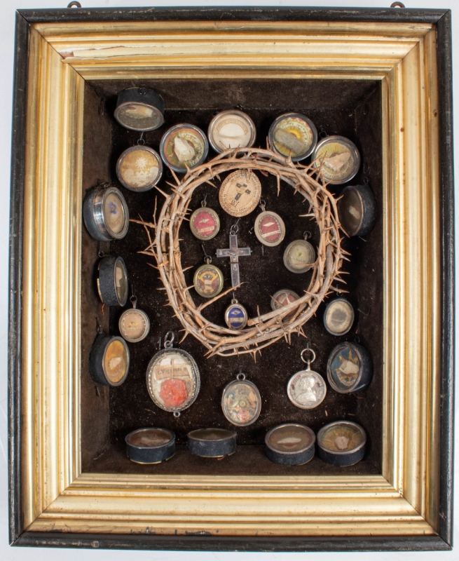 containing 25 relics, most with wax seals on the reverse (including a tooth, hair, pieces of bone and fabric), a crown of thorns and a medal of Leo XIII.