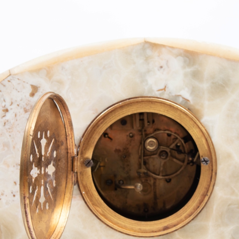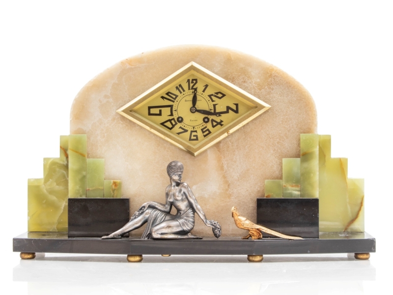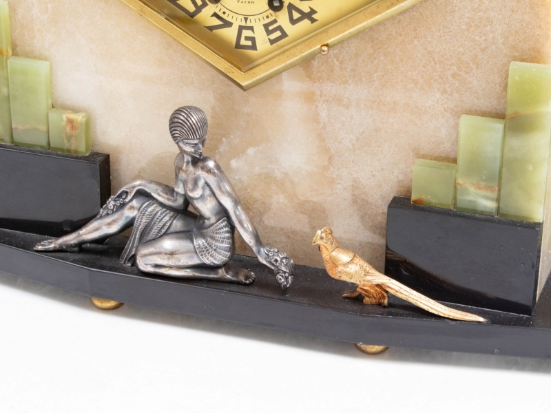 Art Deco clock decorated with a woman and a peacock