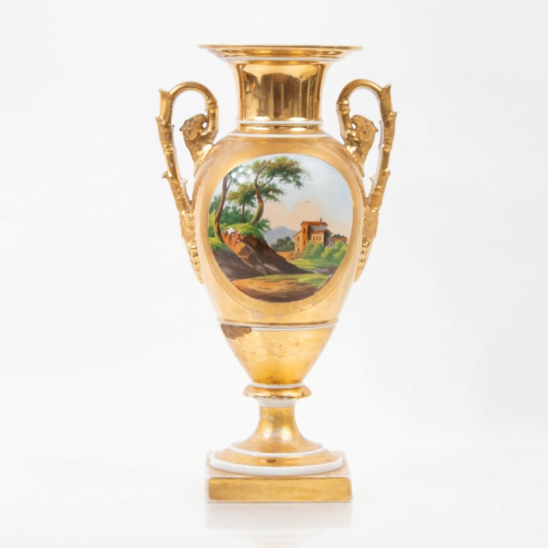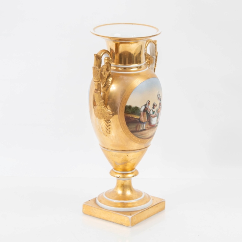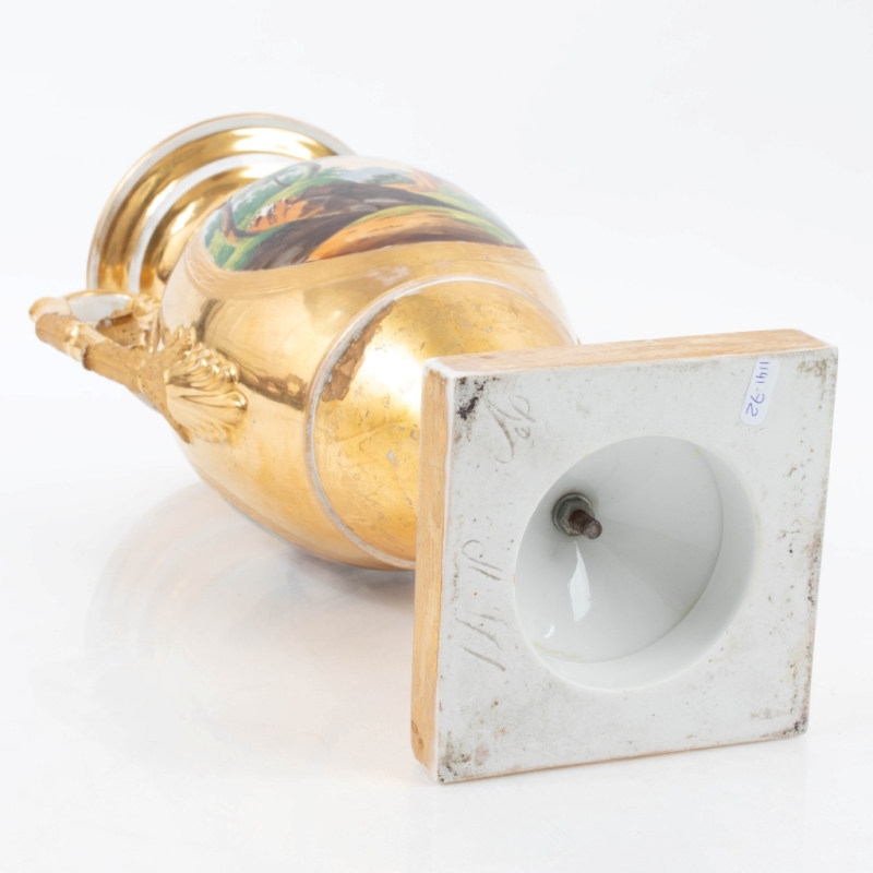 a hairline crack along the rim, loss of gilding, a small chip on a handle H: 37 cm