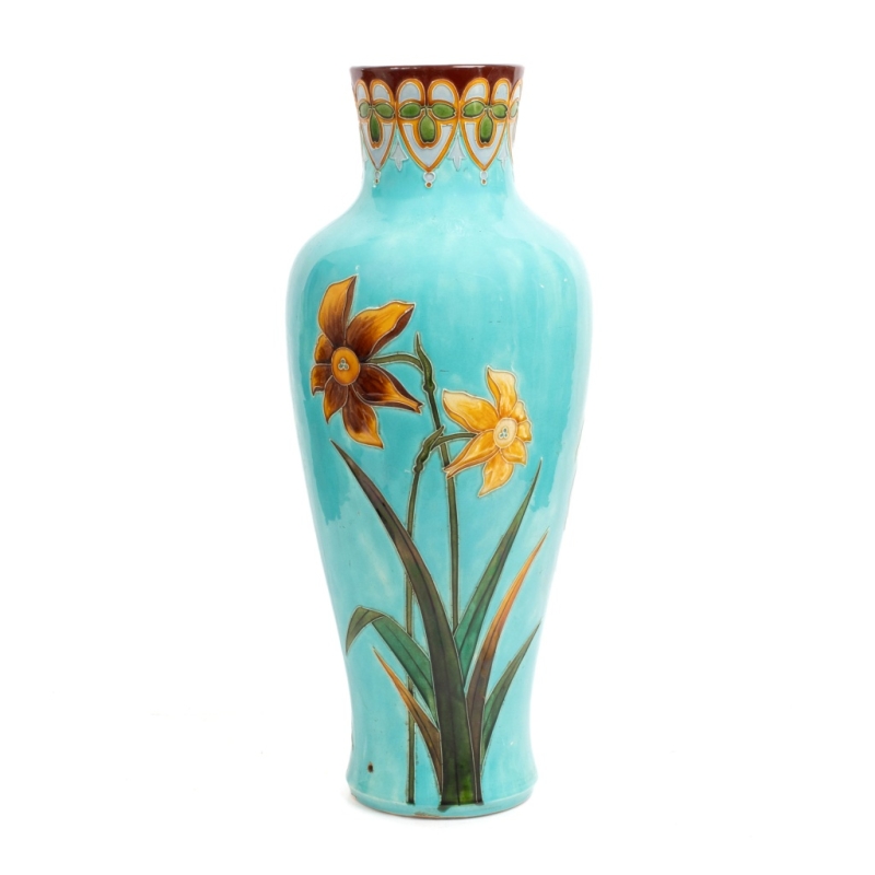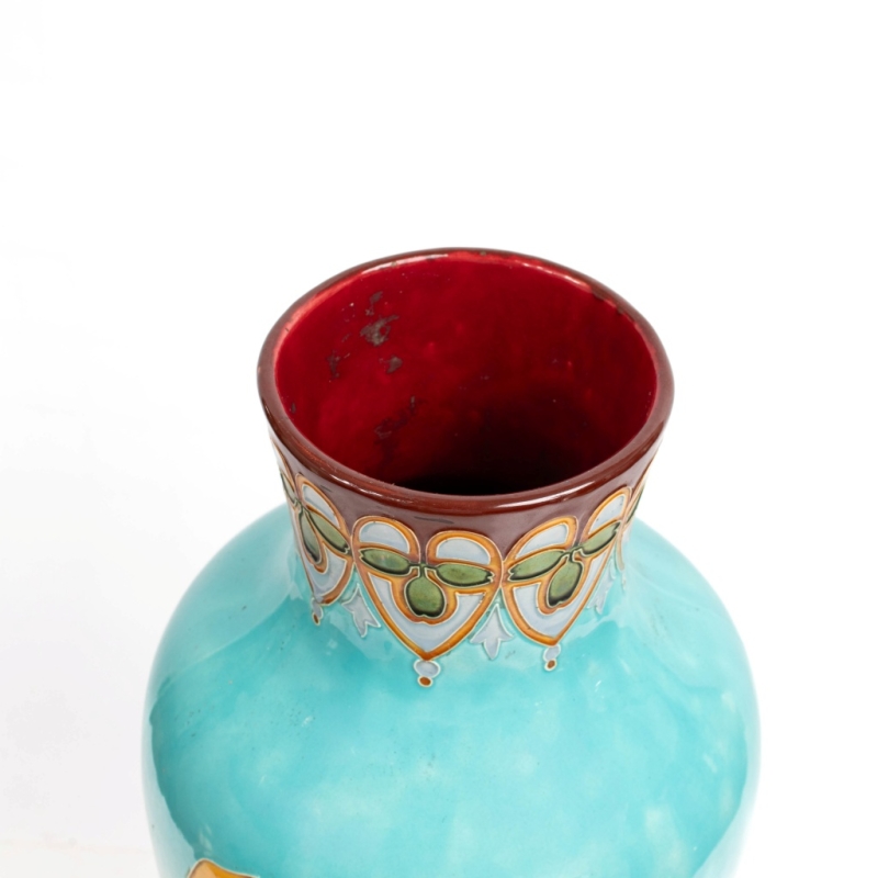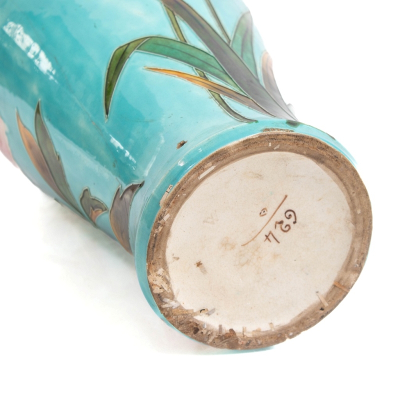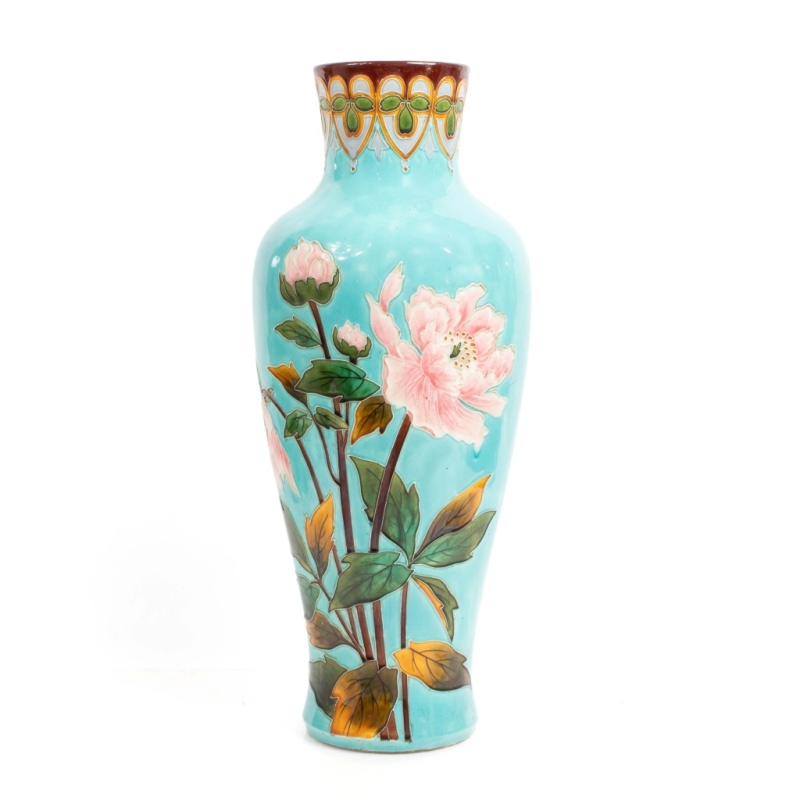 in ceramic with polychrome enamelled decoration of peonies on a turquoise background
