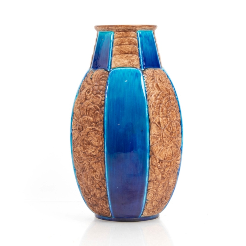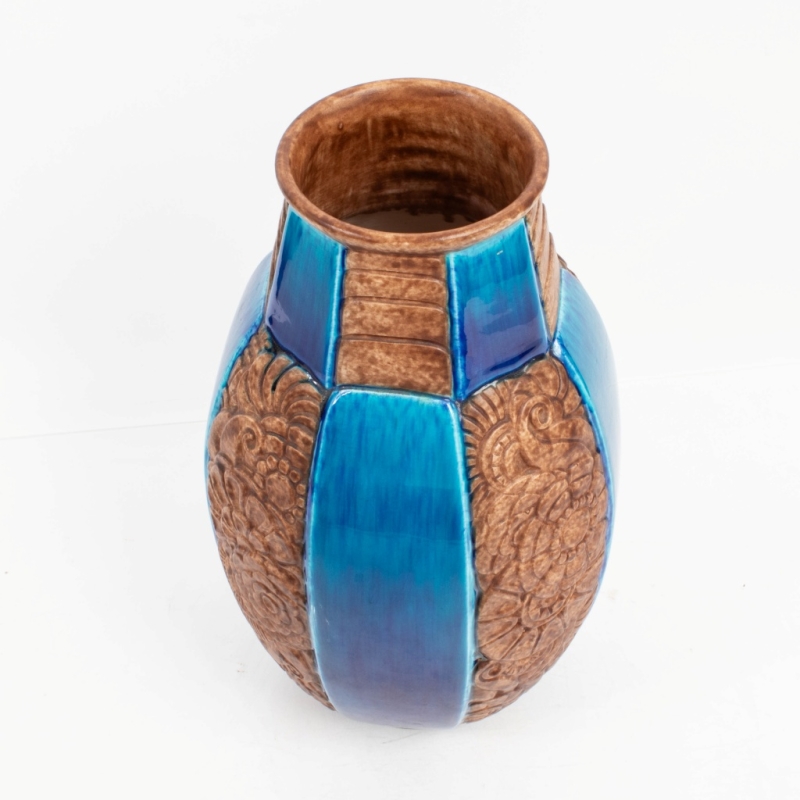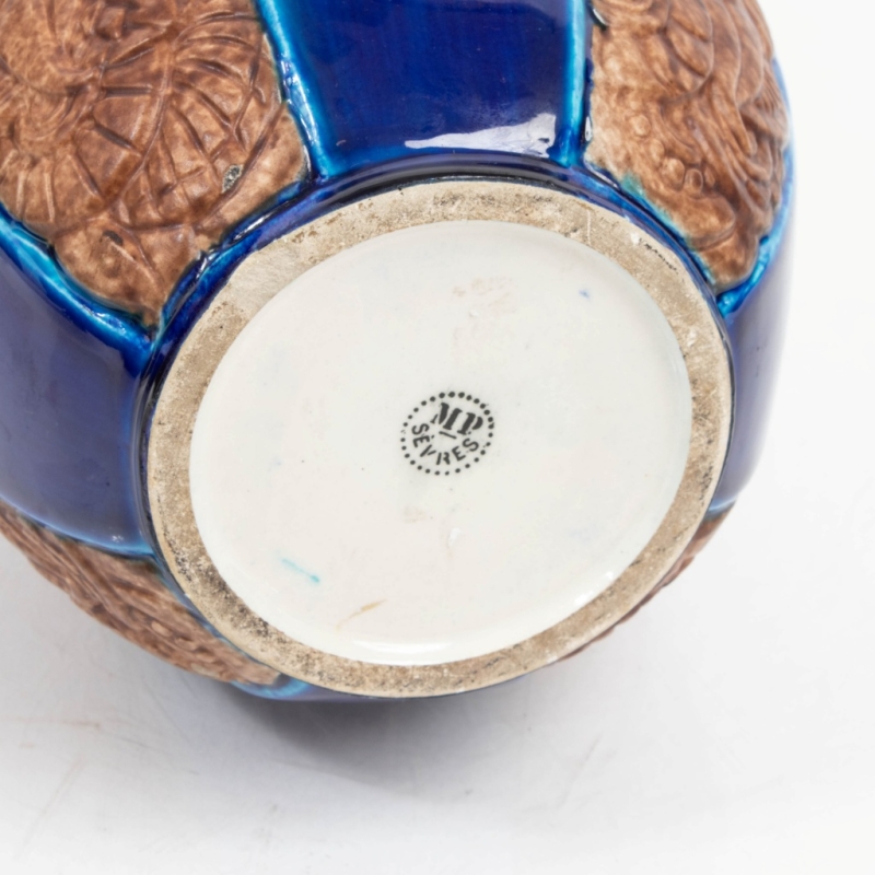 pear-shaped with bevelled sides, turquoise-glazed exterior alternating with a light brown floral relief decoration, signed on the base