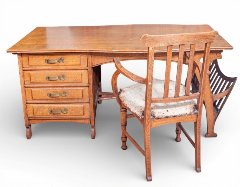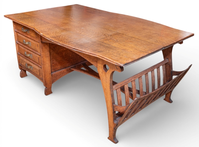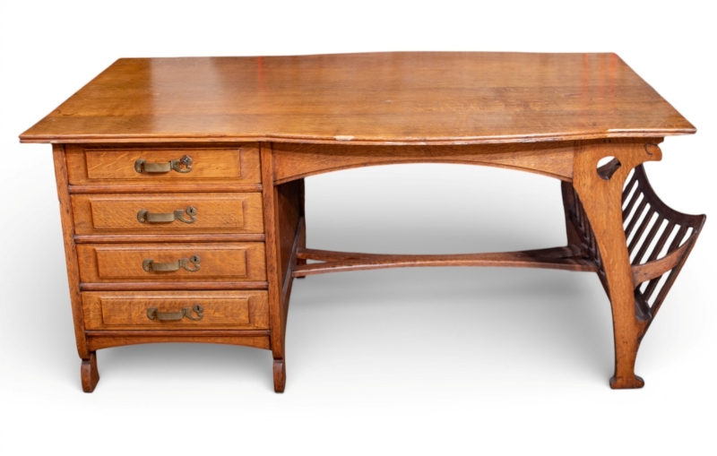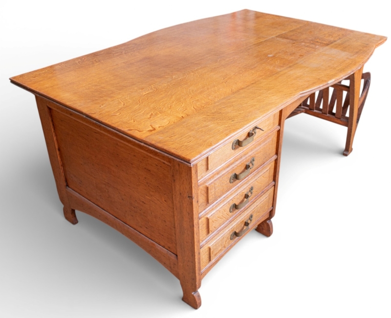 in oak, featuring a side print holder and four drawers, handles and lock plates in hammered copper, original key signed Serrurier Bovy Liège.