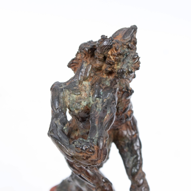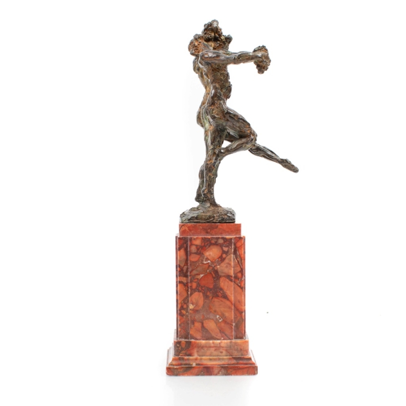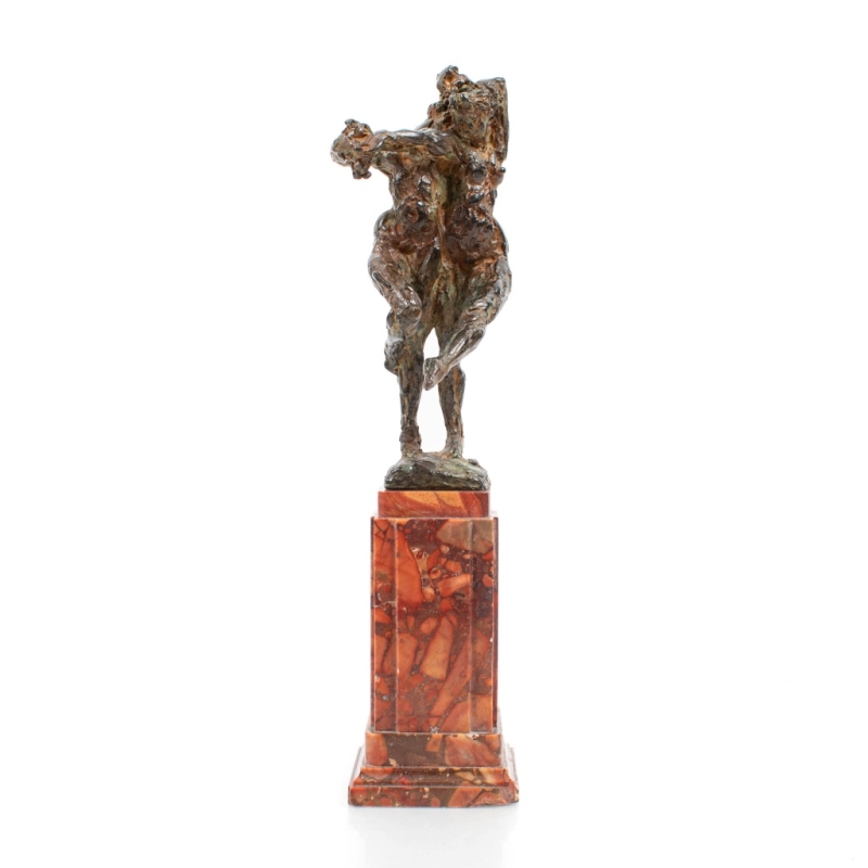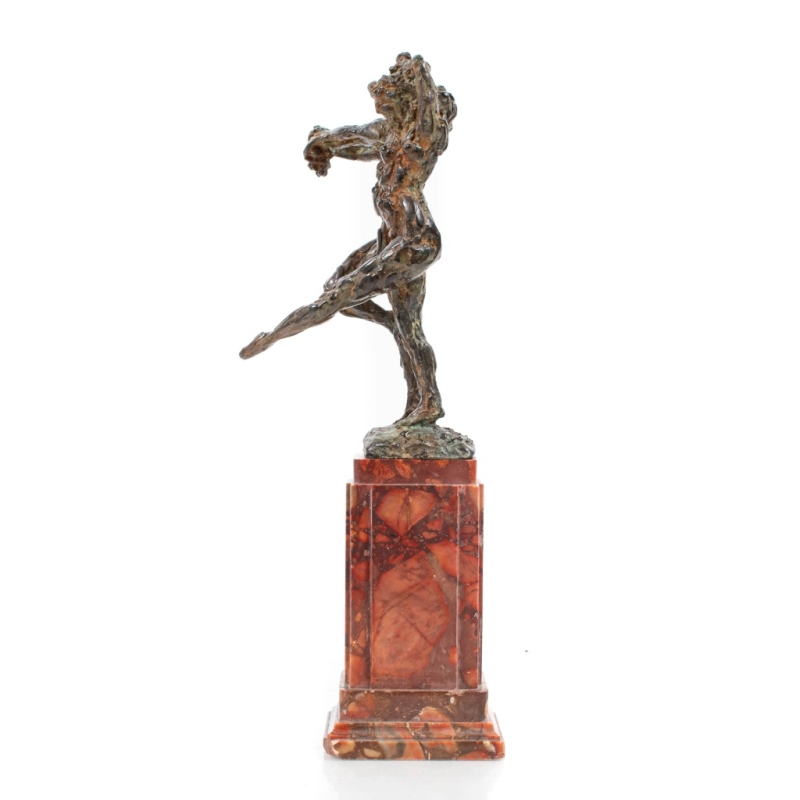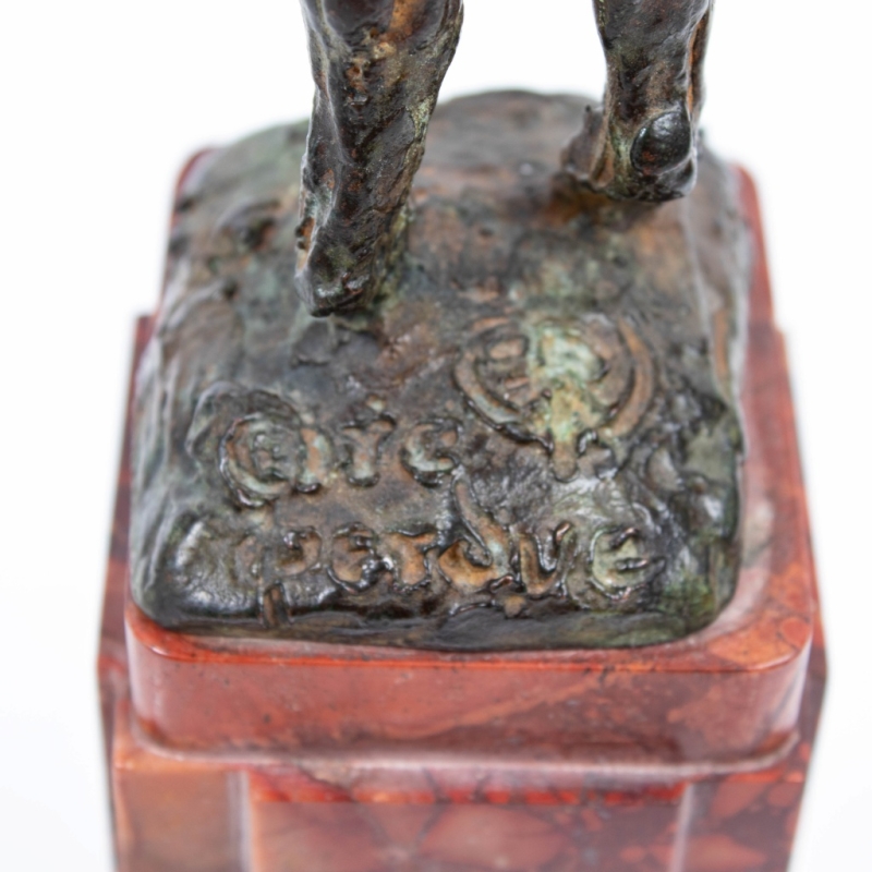 Bronze sculpture with a green-brown patina, signed with a monogram, inscribed ‘lost wax’. Base in red cherry marble