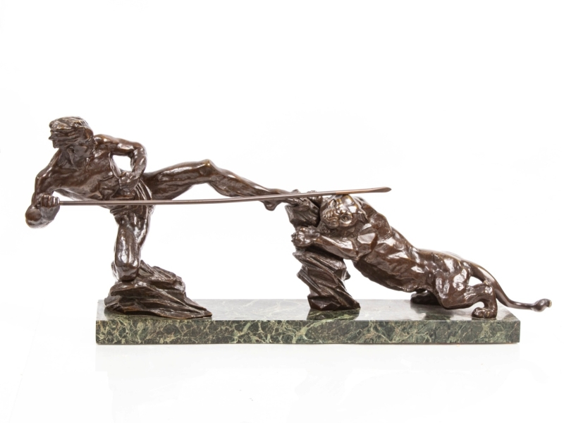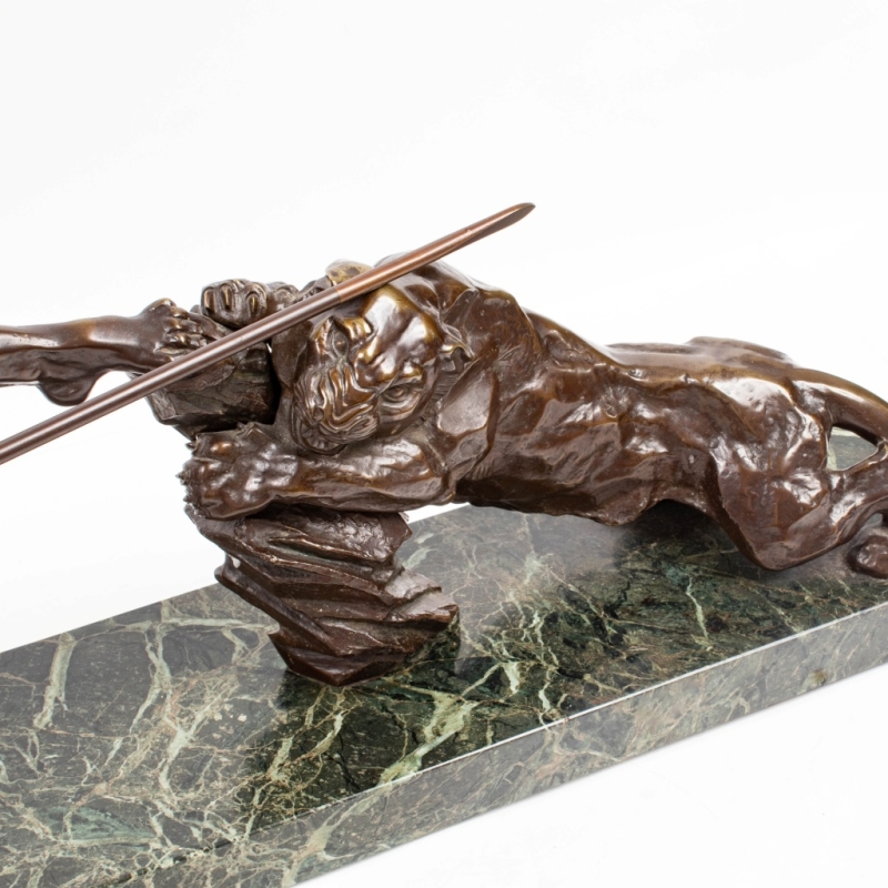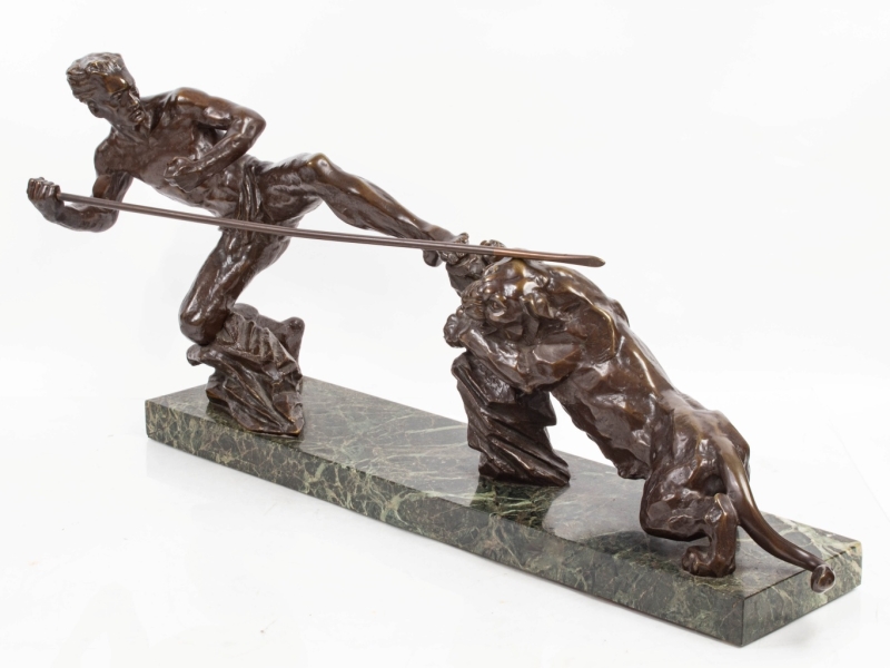 bronze sculpture with a brown patina, sea-green marble plinth, signed