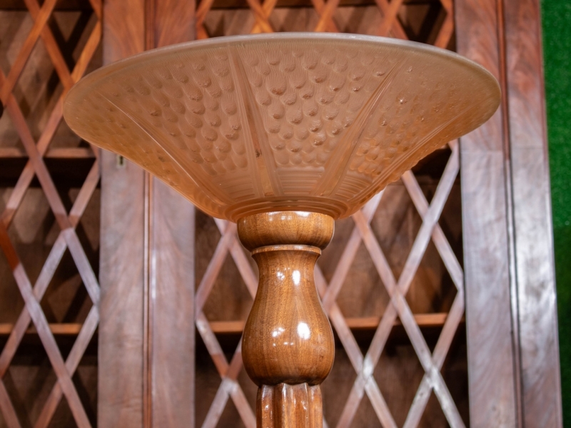 carved wooden shaft, pink-orange moulded glass bowl, signed