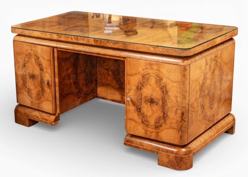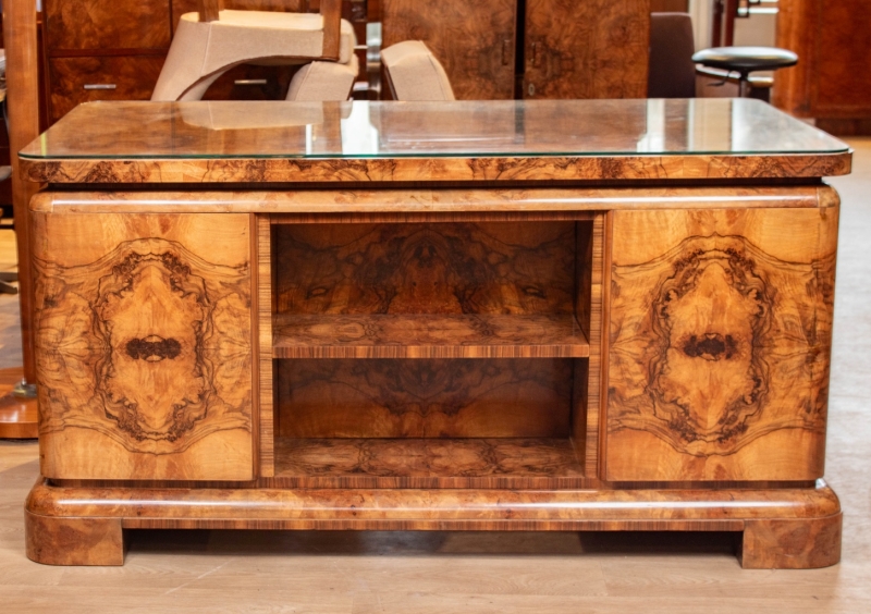 in burl walnut veneer with glass top