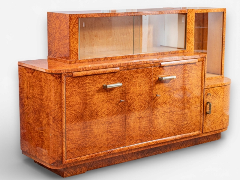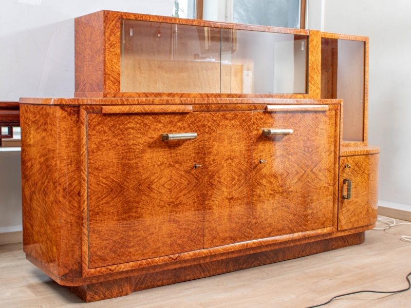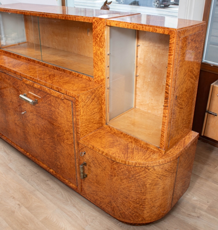 in Amboina burl veneer, opening at the top via a display cabinet with sliding doors, on the right-hand side via a display cabinet with a side-opening door, in the centre section, two sliding marble shelves, and at the bottom, three doors with chrome-plated metal tube handles