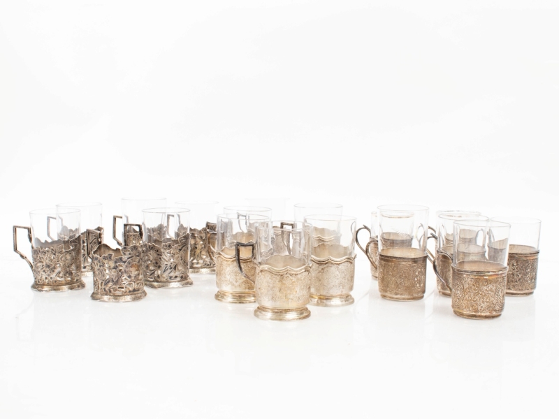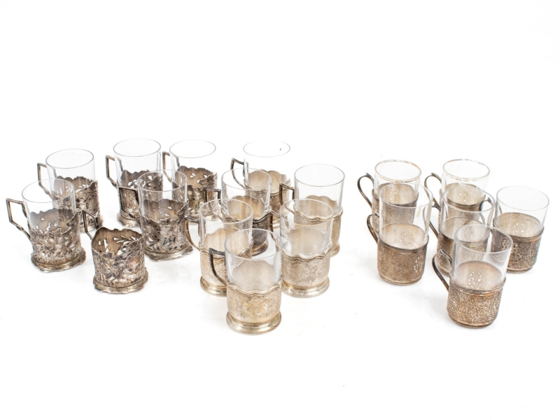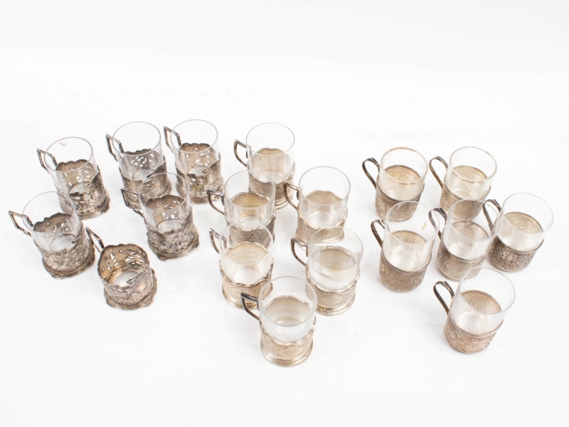 in silver and glass, each comprising six glass tea cups, some engraved, and their stands (18 in total, including one without a cup)