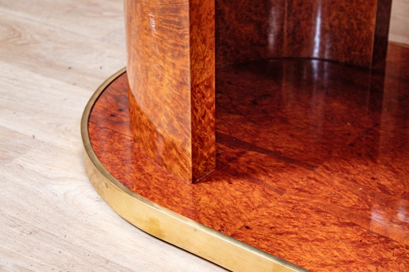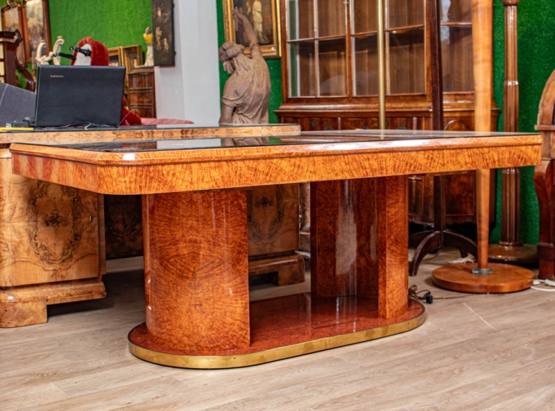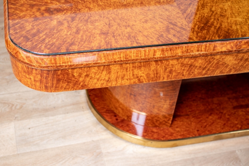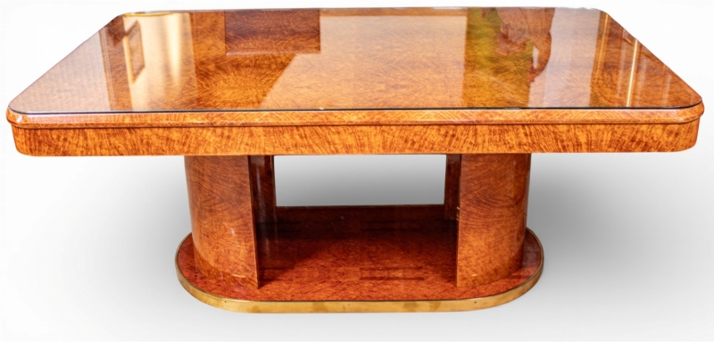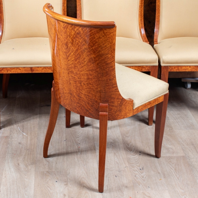 comprising an extendable table and six chairs, in Amboina burl veneer with a glass top. Chairs reupholstered in yellow and grey striped fabric