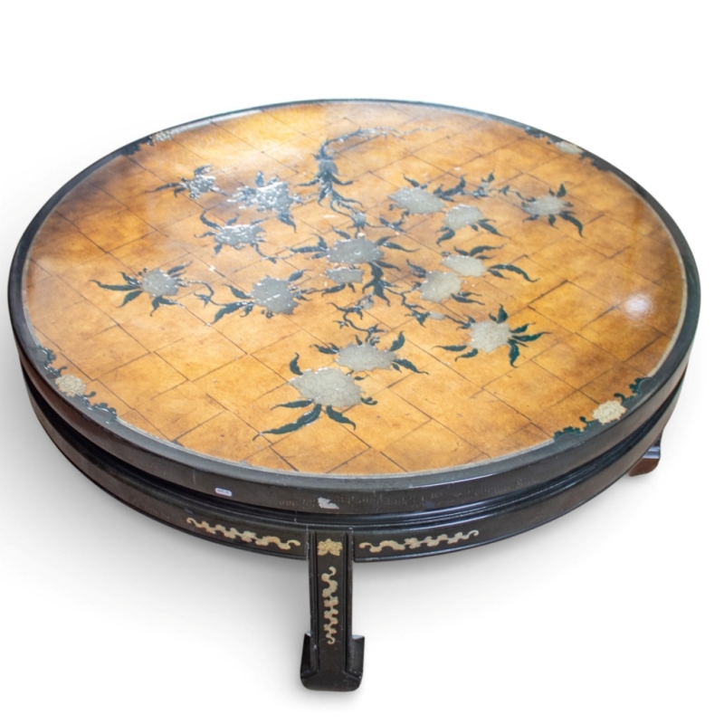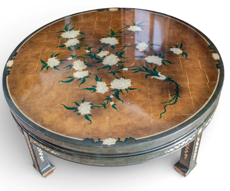 Round, lacquered wood with a floral design on a gold leaf background, top covered with a glass panel