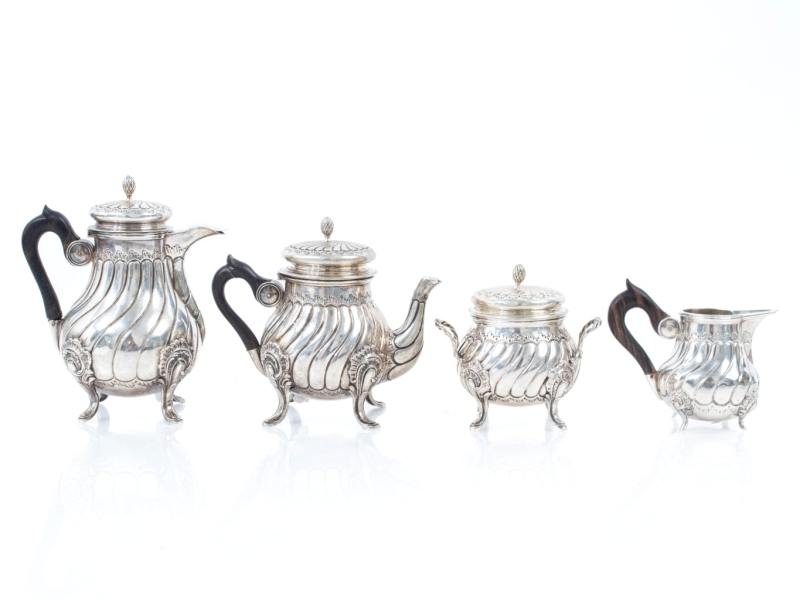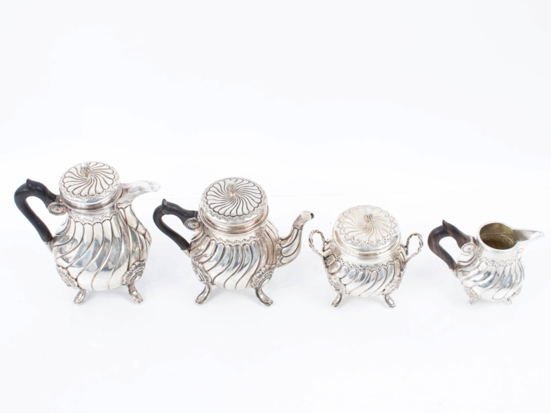 in silver with a torso-shaped body and ebony handle, comprising a teapot, a coffee pot, a milk jug and a sugar bowl. M.O. hallmark on three pieces