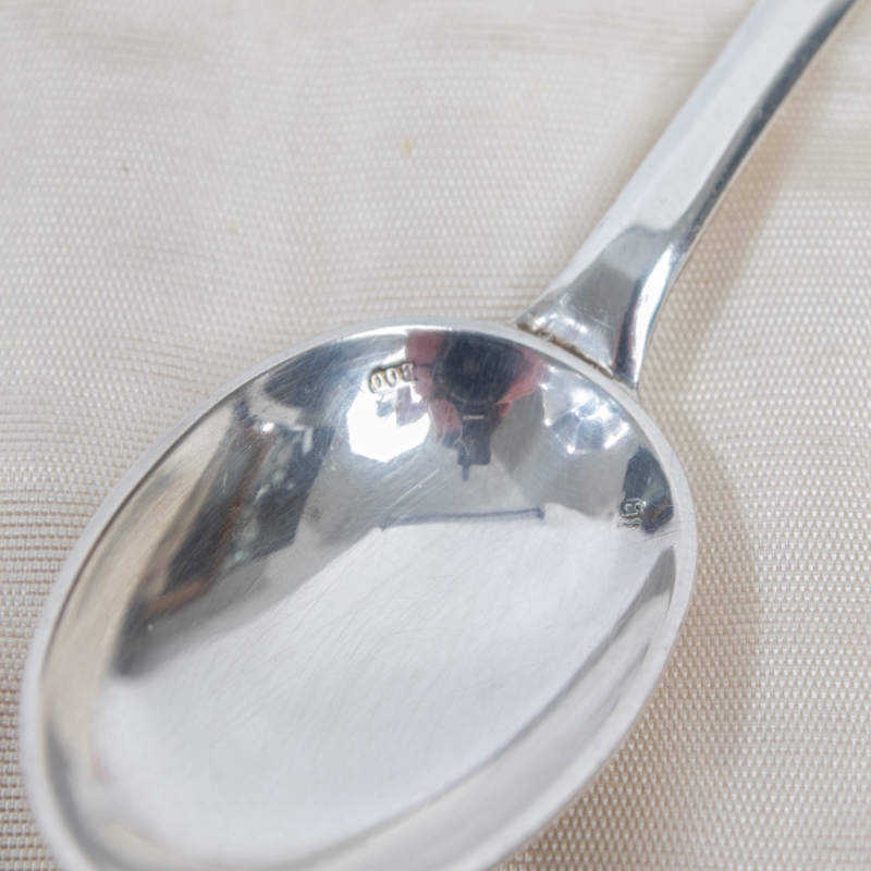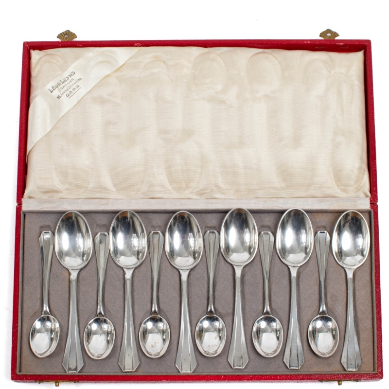 in silver, 12 coffee spoons and 12 tea spoons, hallmarks M.O and 800, in a case by Léon Leyns (Ghent)