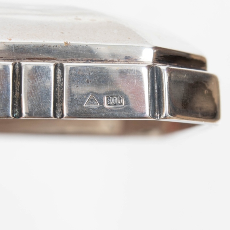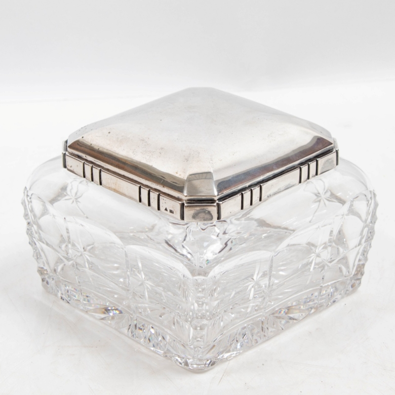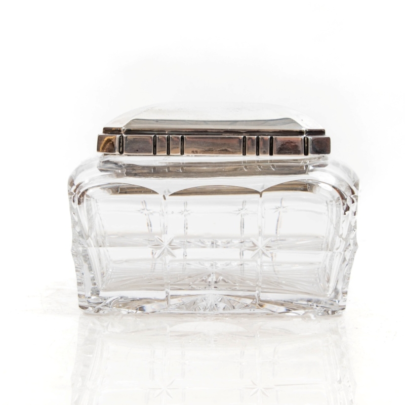 with silver lid and ring, body in cut crystal, quadrangular in shape with fluted sides. Hallmarks M.O. and 800