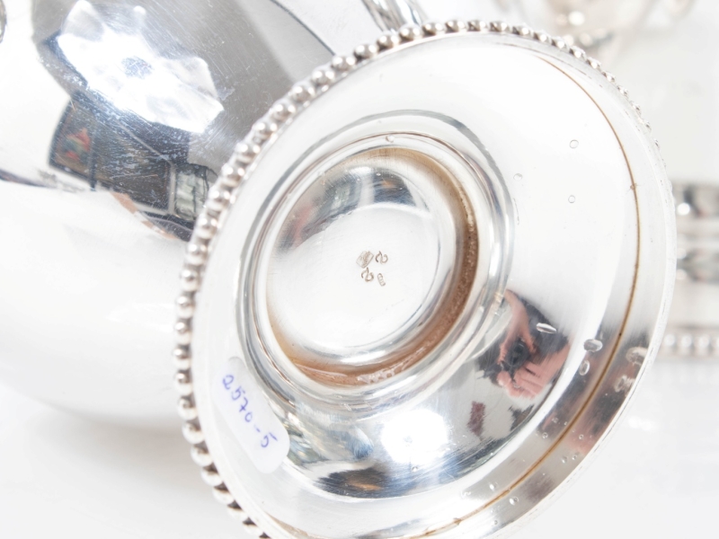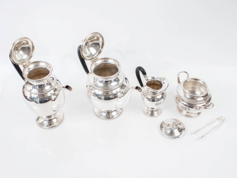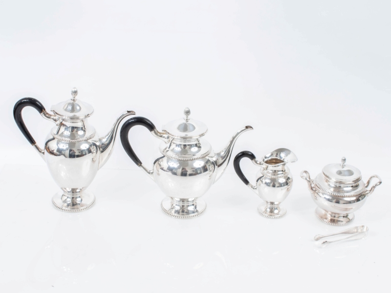 in silver with blackened wooden handles, comprising a teapot, a coffee pot, a milk jug and a sugar bowl. Hallmarks: M.O. and A835.