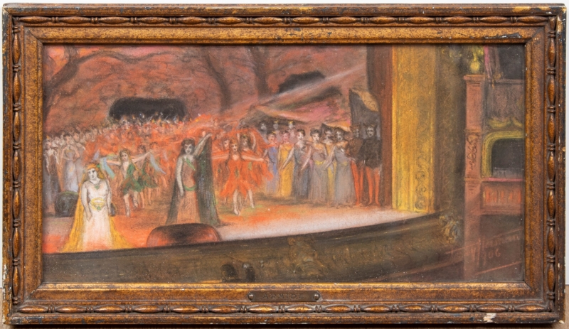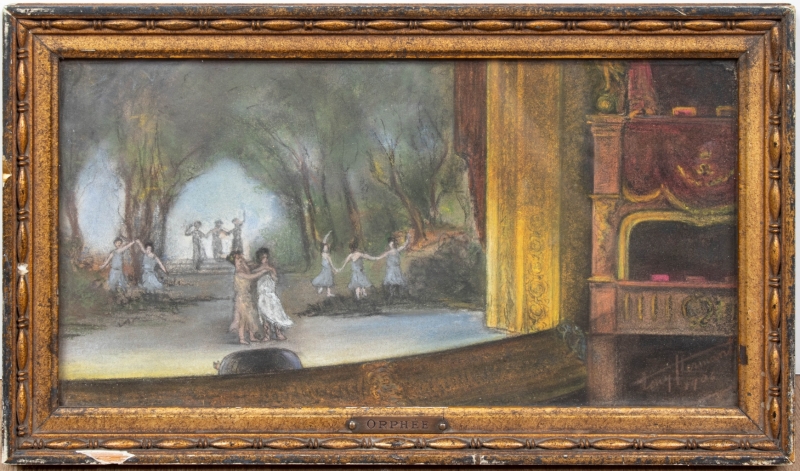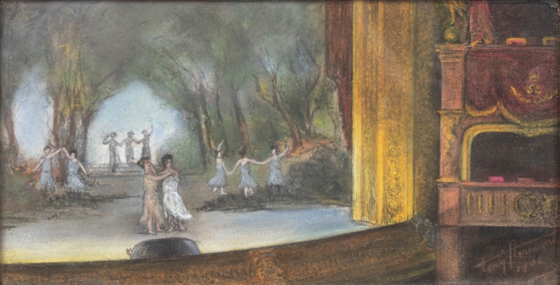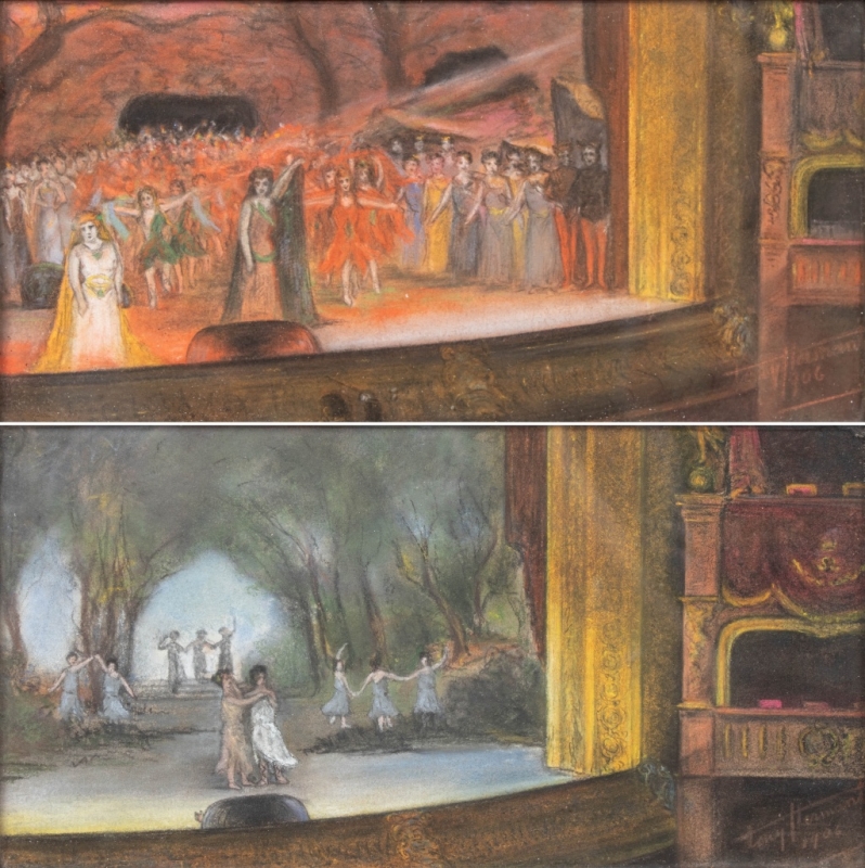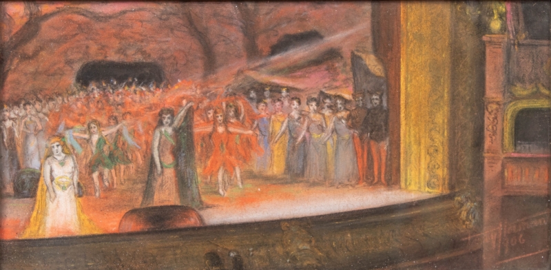 two pastels depicting operas, signed and dated lower right, on the reverse, titled, dated, and listing the names of the actors and their roles.